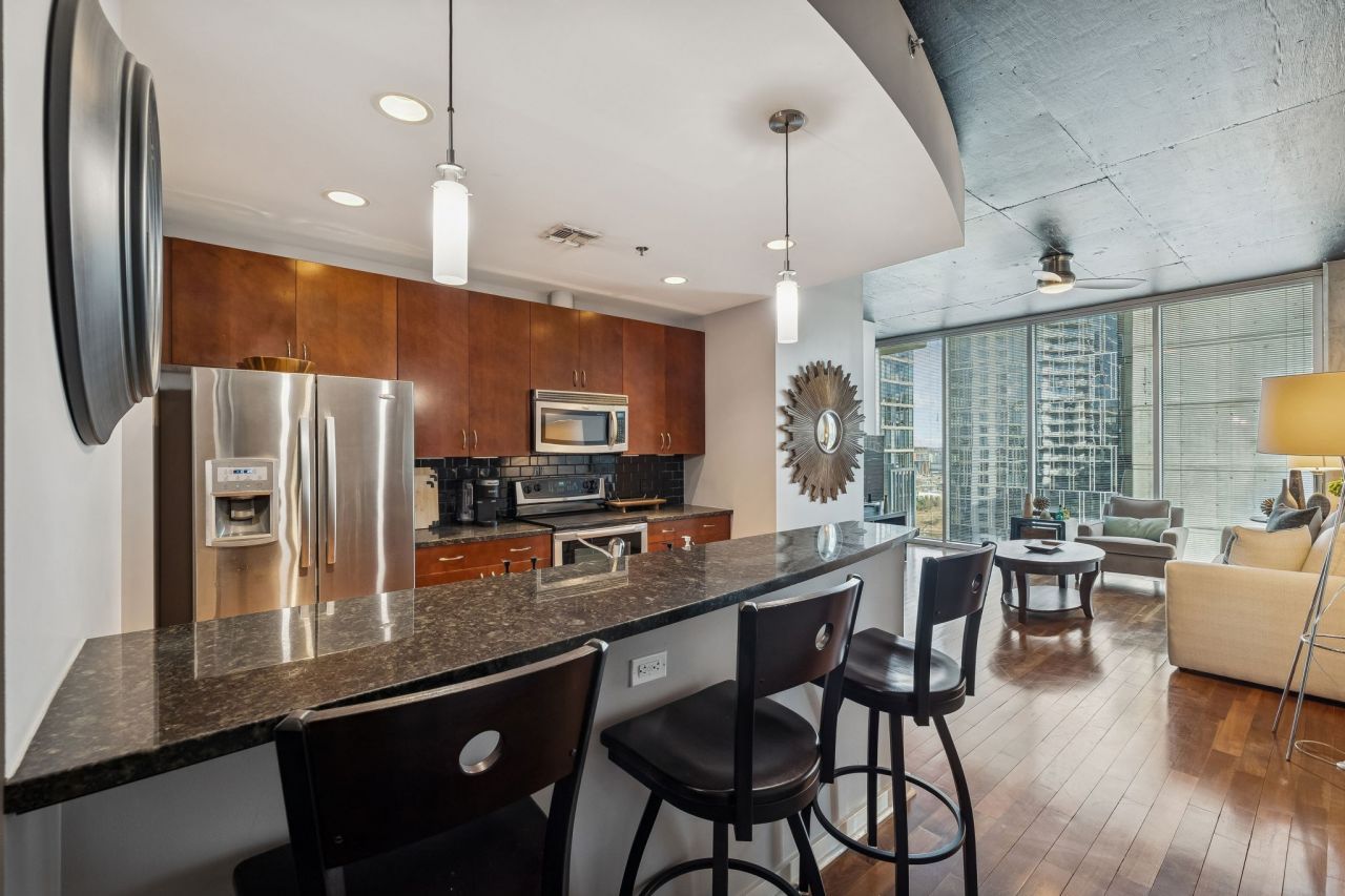 Luxury condo in the heart of Downtown Nashville located on the seventeenth floor! Furnished OR unfurnished!! With custom cherry oak wood flooring, an upgraded glass shower door and a private balcony facing the river offering stunning views, this residence also boasts a spacious walk-in closet and a generously-sized pantry. Enjoy the pleasures of a beautiful pool and utilize the impressive amenities provided. Conveniently walkable to renowned attractions such as Broadway, Bridgestone Arena, and Nissan Stadium, this property offers the perfect location. 24-hour concierge service is available for your assistance along with a plethora of bars and restaurants surrounding. Experience High-rise luxury living at Encore!