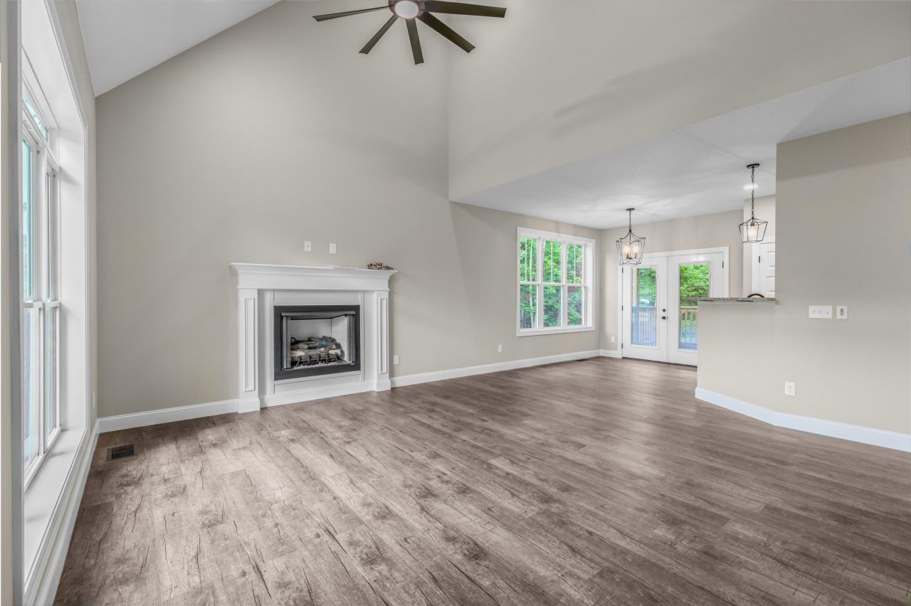 New construction offering 4 bedrooms and 2.5 baths with primary en-suite on main level. Tiled shower, soaker tub and double sink vanity in primary bath. LVP flooring and granite countertops. Gas log fireplace in great room. Vaulted ceilings. Half bath and laundry, 2 car garage and covered back deck complete the main level. 2 additional bedrooms with potential for an 4th bedroom or office/game room and 1 full bath are offered on the top level. Enjoy additional storage or room for future living space in unfinished basement with walk out door onto patio. This lot does touch the lake and had some water this spring and summer. Home comes with an 1 year builders warranty at closing. Annual HOA fee of $275 gains access to the inground swimming pool, playground, picnic shelter and boat ramp. All unground utilities. All information deemed reliable but not guaranteed. Buyer to verify everything to their satisfaction.