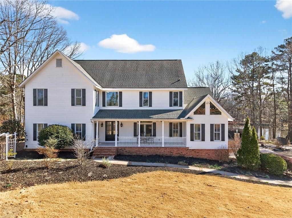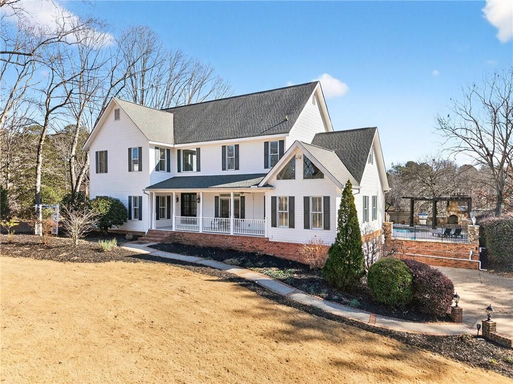 Discover a truly exceptional lakeside retreat - a traditional farmhouse on 1.3 private acres in the coveted Lambert High School district. This estate is theultimate sanctuary, offering a seamless blend of classic elegance and unparalleled outdoor entertaining. Perfectly situated to capitalize on a breathtakingbackdrop, the property features an expansive flagstone patio, resort-style pool and spa, outdoor kitchen, and fireplace - all overlooking a serene 5-acre lakewith a private dock.The interior is defined by a stunning architectural flow, anchored by a dramatic, vaulted and beamed family room with a white brick fireplace and wide-plankpine floors that open directly to the pool terrace. This impressive space flows naturally into the incredible chef's kitchen, a spacious eat-in masterpiecedesigned for both daily life and grand gatherings. Centered around a massive stone-topped island with seating, the kitchen is equipped with premium stainless steel appliances, including a Wolf six-burner range and side-by-side double ovens. Stone countertops and a custom backsplash complement the views of the lake through large, sun-lit windows.The main level continues to impress with a large, elegant dining room and a luxurious primary suite that serves as a true retreat, offering custom closets anddirect access to the outdoor oasis. Additionally, a versatile secondary bedroom and full bath on the main level - currently staged as a private home office,provide the perfect flexible space for guests or a quiet workspace. The full finished basement, complete with a large entertainer's bar, ensures this home isready for any event. Combining sophistication with sustainability, the home is efficiently powered by a geothermal heating and cooling system. The expansivegrounds further embrace the farmhouse lifestyle with a charming, custom-built chicken coop and goat house, complete with a fenced enclosure and whimsicalstring lighting. Located just minutes from the premier shopping and dining at Avalon, Halcyon, and Johns Creek, this property offers a rare combination ofprivacy and convenience.