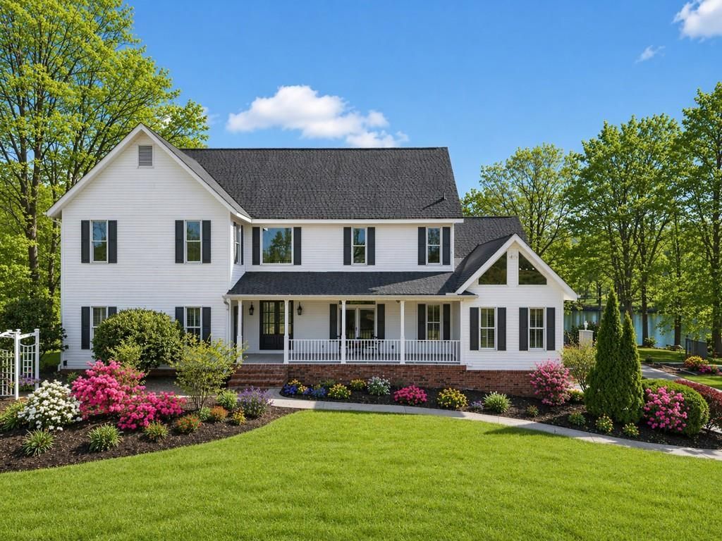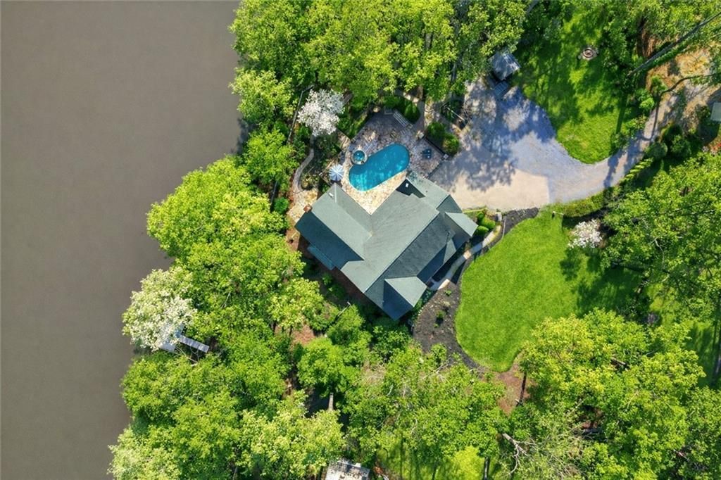 Discover a truly exceptional lakeside retreat - a traditional farmhouse on 1.3 private acres in the coveted Lambert High School district. This estate is theultimate sanctuary, offering a seamless blend of classic elegance and unparalleled outdoor entertaining. Perfectly situated to capitalize on a breathtakingbackdrop, the property features an expansive flagstone patio, resort-style pool and spa, outdoor kitchen, and fireplace - all overlooking a serene 5-acre lakewith a private dock.The interior is defined by a stunning architectural flow, anchored by a dramatic, vaulted and beamed family room with a white brick fireplace and wide-plankpine floors that open directly to the pool terrace. This impressive space flows naturally into the incredible chef's kitchen, a spacious eat-in masterpiecedesigned for both daily life and grand gatherings. Centered around a massive stone-topped island with seating, the kitchen is equipped with premium stainless steel appliances, including a Wolf six-burner range and side-by-side double ovens. Stone countertops and a custom backsplash complement the views of the lake through large, sun-lit windows.The main level continues to impress with a large, elegant dining room and a luxurious primary suite that serves as a true retreat, offering custom closets anddirect access to the outdoor oasis. Additionally, a versatile secondary bedroom and full bath on the main level - currently staged as a private home office,provide the perfect flexible space for guests or a quiet workspace. The full finished basement, complete with a large entertainer's bar, ensures this home isready for any event. Combining sophistication with sustainability, the home is efficiently powered by a geothermal heating and cooling system. The expansivegrounds further embrace the farmhouse lifestyle with a charming, custom-built chicken coop and goat house, complete with a fenced enclosure and whimsicalstring lighting. Located just minutes from the premier shopping and dining at Avalon, Halcyon, and Johns Creek, this property offers a rare combination ofprivacy and convenience. Some exterior photos have been digitally enhanced to show a lush green lawn and foliage.