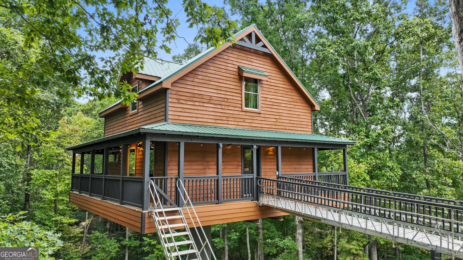 Ever wonder what it would be like to live in a treehouse? This home is just that-rising majestically into the air among soaring trees, this cabin is unlike anything you have ever seen. Take a quick walk across the bridge and you are immediately immersed in nature. From the wraparound covered porch, where you can enjoy a good book and a warm cup of coffee, to the elegant and refined interior, this home is truly one of a kind. The main-level family room and kitchen provide a wonderful space to entertain or simply unwind while enjoying the warmth of the fire. The spacious primary bedroom on the main level features expansive forest views and a luxurious en suite bathroom complete with a sauna, whirlpool tub, and separate shower. Upstairs, an additional bedroom provides the perfect space for guests, while the loft area features a massage table, massage chairs, and a spa-like atmosphere designed for complete relaxation and wellness. Outside, the private hot tub invites you to unwind, while the fire pit area offers the perfect place to share stories with friends and watch the stars drift across the night sky. This magical cabin is the perfect getaway retreat for anyone looking to reconnect with nature, relax in comfort, and experience a truly unique mountain escape and just 30 Minutes to Unicoi State Park: Great for hiking, fishing, and paddleboarding.