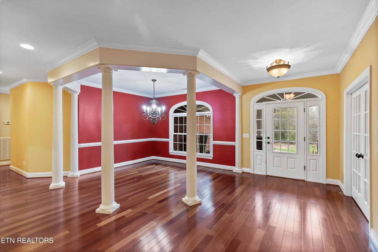 Located in the prestigious and gorgeous Mountain Pointe Subdivision, this custom brick ranch sits on .80 acres and offers 4 bedrooms, an office, and 5 full bathrooms with exceptional craftsmanship throughout. Features include Brazilian Cherry flooring, 12-foot ceilings, transom windows, crown moldings, granite countertops, custom cabinetry, a formal dining room, built-in bookcases, and a custom mantle over the fireplace. The spacious kitchen includes a large island, walk-in pantry, and a dual-fuel range with gas cooking and electric ovens-the top oven doubles as a toaster oven, and both offer convection and standard baking options-plus a separate breakfast area. Two primary bedrooms are located on the main level, each with oversized custom closets; one offers a large sitting area, and the main suite feels like a private spa with a jetted tub and walk-in shower. The split-bedroom layout provides privacy, while the large laundry room with sink and abundant storage adds convenience. A sprawling finished basement is perfect for a great room, media room, or separate living quarters and includes generous unfinished space ideal for storage or future expansion. Outdoor living features a covered screened porch, double decks, and a private backyard backing up to wooded scenery offering complete privacy and frequent wildlife views, including deer and turkey. Natural gas is run to the patio for easy gas grilling, and a hot-water recirculating pump provides instant hot water. Two oversized garages provide four total parking spaces-one on the main level and one on the basement level. This home offers luxury, space, and privacy in one of the area's most desirable neighborhoods.