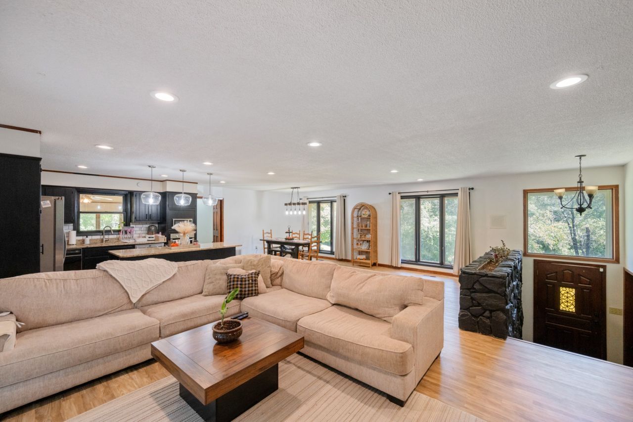 Welcome to this stunning and spacious 4-bedroom, 3-bath home offering 2,702 sq ft m/l of beautifully updated living space, nestled on 2.4 acres m/l of peaceful land with a large front yard and a quiet, private backyard. Step inside to an open-concept floor plan that seamlessly connects the kitchen, dining, and living areas-perfect for everyday living and entertaining. This home features brand-new flooring throughout and heated bathrooms for added comfort and luxury. The inviting sunroom is ideal for quiet reading, relaxing mornings, or gathering with friends to watch the big game. The finished basement offers a spacious recreation room, one bedroom, one full bath, and garage access, providing flexible space for guests, a home office, or additional living areas. Recent updates include a new roof, new flooring throughout, and all new appliances, which convey with the home. Offering the perfect blend of privacy, space, and modern comfort, this move-in-ready property is one you don't want to miss. Schedule your private showing today and experience all this beautiful home has to offer!