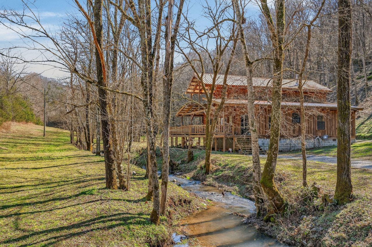 As you enter the property, you cross a covered bridge with the creek running along the front, immediately setting the tone for the peaceful setting. The home sits overlooking the water with an 800 sq ft full-length front deck that provides plenty of space for entertaining or relaxing. A hot tub is already in place, making it easy to enjoy the view year-round.Inside, the home features 3 bedrooms and 2 bathrooms with an open-concept layout. The kitchen includes an island and a wood-burning stove that serves as an additional heat source. There are two wood-burning fireplaces, one located in the living room and another in the primary bedroom. Wood walls, natural wood flooring, and vaulted ceilings with exposed beams give the home a warm, cabin-style feel.Upstairs, an 18 x 20 loft provides flexible space for an office, bonus area, or additional sleeping space. The loft is carpeted, while the bathrooms feature tile flooring and classic clawfoot tubs. The primary bathroom is currently needing to be finished. Spacious closets and additional storage areas add functionality.Outside, the property includes a two-car detached garage with an attached carport, a workshop with a concrete floor, a gravel driveway, and a trail that runs through the acreage leading to an additional potential building site. A natural spring is also located on the property in addition to the creek..With approximately 1,895 feet of road frontage, this tract offers potential for subdivision or future development if desired.Property is being sold as is. HVAC NEW 2024. Tankless Water Heater.