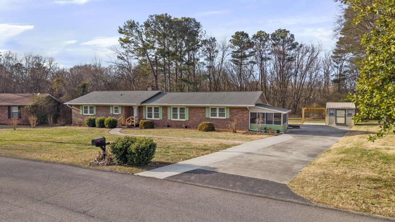 Welcome home to this beautifully maintained brick rancher offering 3 bedrooms, 2 bathrooms, and 2,242 square feet, all on one level. Nestled in a quiet, well-established neighborhood, this home sits on a large lot and offers both comfort and convenience just minutes from shopping and restaurants. Inside, you'll find two spacious living areas,one formal with hardwood floors and the other less formal with carpet. Additionally, there is a cozy den featuring beamed ceilings and a fireplace with gas logs, perfect for relaxing or it could serve as a dining room. The updated kitchen is equipped with stainless steel appliances and hard-surface countertops, flowing seamlessly into the main living spaces. Hardwood floors highlight much of the home, while tile flooring in the bathrooms and newer tile showers add a fresh, modern touch. Enjoy year-round outdoor living with an 11x19 screened porch and a 10x15 covered deck, ideal for morning coffee or evening gatherings. Additional features include a dedicated laundry room, two-car garage plus a single carport, and ample storage throughout the home, along with an exterior storage building. An encapsulated crawl space with warranty adds peace of mind. With its thoughtful updates, generous space, and desirable location, this inviting home is ready to welcome its next owner. This property does require flood insurance that has been quoted by local insurance agent at $535 per year.
