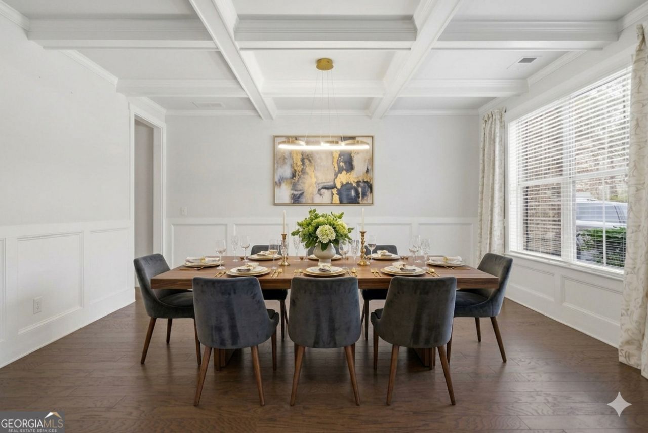 Alpharetta address with coveted low Forsyth County taxes! This impeccably maintained, north-facing residence blends timeless elegance with modern comfort, offering abundant storage and thoughtfully curated upgrades throughout. Retreat to the luxurious owner's suite, featuring a spacious sitting area ideal for a serene library or reading nook, a fully customized walk-in closet system, and a spa-inspired bathroom with a deep soaking tub - your perfect escape for relaxation. The main floor showcases today's most sought-after design trends, including refined wood trim accents, sophisticated built-in cabinetry with ambient lighting, and an expansive dining room crowned by a stunning coffered ceiling - ideal for hosting gatherings. A versatile guest suite (currently used as a formal living room), a cozy keeping room, a sunlit breakfast area, and a charming sunroom seamlessly connect to the covered patio and fully fenced backyard oasis. At the heart of the home, the chef's kitchen impresses with a massive island for casual dining and entertaining, gleaming granite countertops, premium stainless steel appliances, and a beautifully finished walk-in pantry for effortless organization. Upstairs, each secondary bedroom offers generous walk-in closets, while the oversized lot - extending well beyond the fenced area - is surrounded by mature hardwoods, delivering rare privacy and natural beauty. Completing the home is an updated, inviting garage equipped with custom storage racks providing both function and style.