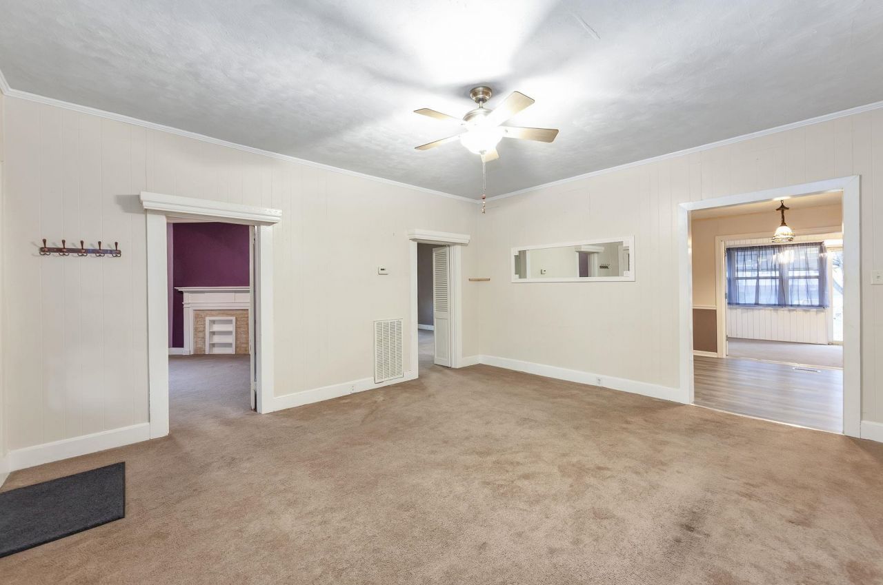 Discover the charm of this quintessential All-American small-town home, brimming with character from its 1920s origins. Unwind on the inviting front porch as you soak in the neighborhood vibes, or retreat to the cozy sunroom at the rear for a peaceful escape. Beneath the current carpet lies beautiful original hardwood flooring, ready to be revealed. Inside, you'll find generously sized rooms, including three bedrooms, two bathrooms, and a dedicated dining area. The kitchen boasts ample cabinetry for all your storage needs. Adding to its appeal, a full basement stretches under the entire house, offering ample storage or potential for expansion, while a convenient shop is located just off the garage, ideal for hobbies or projects. Step from the sunroom onto the brand-new deck, where you can enjoy serene views of the spacious backyard?perfect for gatherings or quiet moments alike.