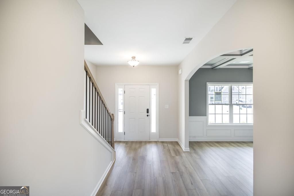 Discover O'Brien Farms in Warner Robins, Georgia, a thoughtfully planned Hughston Homes community designed to complement modern lifestyles. The Cannaberra B Floorplan features 2,864 SF of well-balanced living space with 5 bedrooms and 3 baths, offering flexibility, comfort, and timeless design. The main level welcomes you with a flowing layout that blends defined spaces with open concept living. A dedicated dining area with coffered ceilings adds elegance for entertainment, while the spacious great room centers around a cozy wood-burning fireplace providing a warm, inviting place to gather and relax. At the center of the home, the open kitchen impresses with abundant cabinetry, recessed lighting, beautiful countertops, a tiled backsplash, an electric cooktop, a single oven with microwave, stainless steel vent hood, and a luxury dishwasher. The center island anchors the space, opening seamlessly to the breakfast area and great room, ideal for hosting or everyday living. A walk-in pantry ensures everything has its place. The owner's entry from the garage showcases Hughston Homes' signature drop zone with built-in cubbies, offering smart storage and effortless organization, with a conveniently located bath nearby. A full guest suite on the main level provides convenience and flexibility. Upstairs, the owner's suite offers a comfortable retreat with a spacious layout and private bath featuring a garden tub, tiled shower, vanity, and walk-in closet(s). Secondary bedrooms are thoughtfully sized with ample closet space, while the hall bath and upstairs laundry room are centrally positioned for efficiency. Luxury flooring enhances main-level living spaces, along with the many Included Features Hughston Homes is known for. Outdoor living shines with a 2-Car Garage and our Signature Gameday Patio, complete with a wood-burning fireplace, TV pre-wire, surround sound speakers, and ceiling fan. The Cannaberra plan delivers both comfort and style. Centrally located, O'Brien Farms offers the perfect setting to call home. Come see why the Cannaberra is a favorite.