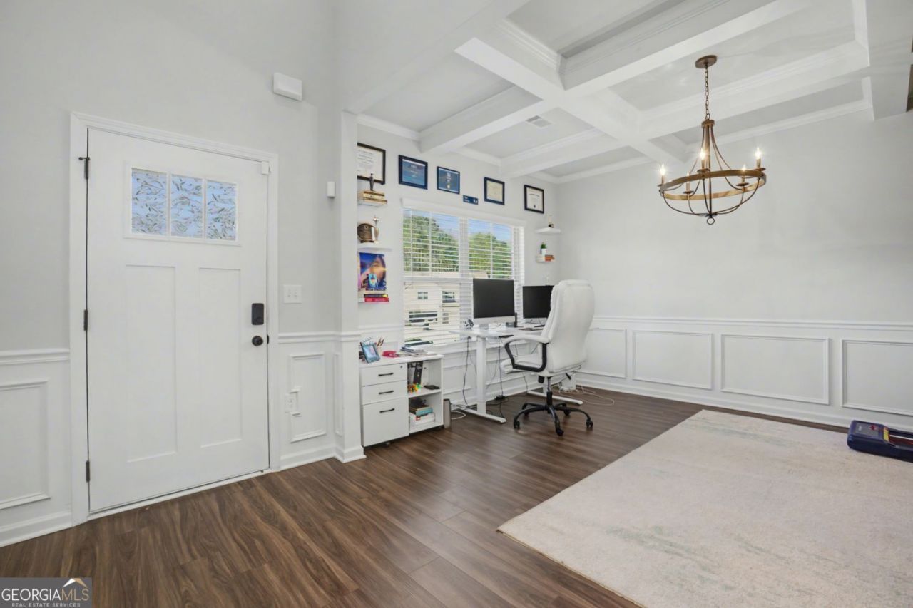 Welcome home to this nearly new 5 bedroom, 3.5 bath brick front home in The Registry sidewalk McDonough community conveniently located near the cul-de-sac. The covered entrance welcomes you into the office/dining room featuring a coffered ceiling. The chef's eat-in kitchen offers double ovens, built-in microwave, large eat at island with granite countertops and tile backsplash all open to the great room with fireplace and ceiling fan. Primary bedroom on the main level offers a coffered ceiling with spa primary bathroom with separate granite countertop vanities, soaking tub, tile flooring, separate shower and spacious walk in closet off of the laundry room. Spacious secondary bedrooms upstairs along with two full bathrooms and a bonus/media room and office spaces. Enjoy your covered patio overlooking the level backyard. Conveniently located near shopping, dining, schools, and major highways, this home blends comfort, convenience, and charm ready for its next owners to make it their own. Schedule your showing today and make 408 Tavistock Court McDonough, Georgia home!