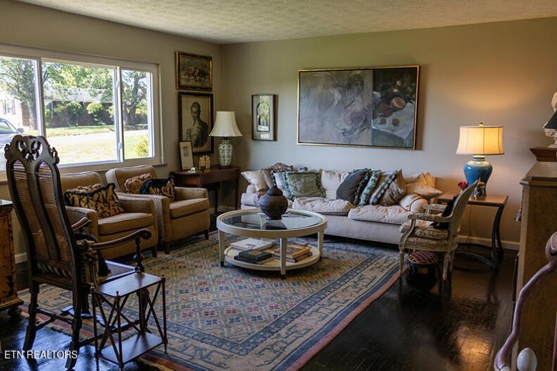 ARTIST'S/ DESIGNER'S PERSONAL RESIDENCE. UPDATED & LOADED WITH CHARM! Hilltop basement rancher with stunning Great Smoky Mtn Front Views. Multiple recent upgrades/ architectural enhancements. Living Room/ Dining Room fusion w/ atrium door walk-out to covered rear porch. Spacious updated Kitchen with stainless appliances, luxury gas range, built-in LG laundry tower, and great newly added service areas. Front facing Living Room w/ tons of light and Mtn. views. 3 main level bedrooms w/ 2.5 updated baths, and a basement Bedroom & Bath plus dual Rec/ Hobby Rooms (ideal for future apartment conversion or leisure space). Basement has large room-sized storage area/ workshop, and garage with lower driveway access (ideal for Boat or RV parking.) [Tandem Carport services the main level, as well as a rear porch w/ both covered & open areas]. Property has had multiple recent enhancements and is ready for a new owner. Primary area hardwood floors, fresh interior paint, and tons of appeal. [NOTE; Some photos are digitally enhanced to minimize Owner/Designer's stored items].