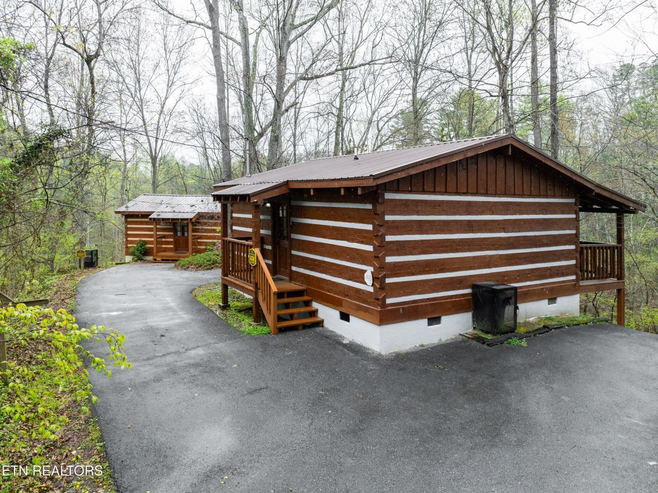 Incredible opportunity to own four income-producing log cabins tucked away in the popular Gatlinburg Arts and Crafts district! These cabins are nestled amidst mature hardwoods and colorful wildflowers, benefiting from the serenity of the Smokey Mountains. All units are beautifully maintained with new roofs, flooring, exterior stain, and fresh interior paint. Fantastic location near downtown Gatlinburg, Pigeon Forge, Dollywood, and other attractions. This is a great chance to own a money-producing portfolio, ideal for a 1031 Exchange, and is currently cash flowing. Cabin 4130 offers a spacious 1,486 sq ft layout with 2 bedrooms and 2 full baths. Take in the wildlife that pass through this woodsy, natural area from your covered front porch. A hot tub awaits to soothe sore muscles and melt away stress. Step inside where the great room is graced by a stone mantled fireplace to create a cozy place to relax and recharge. Beautifully detailed wood finishings add to the rustic, comfortable vibe found throughout. There is a ton of cabinet storage in the full kitchen and the full main floor bathroom is a treat with jetted soaking tub and separate walk-in shower. There is one bedroom on the main level as well as a second bedroom off the game loft with its own ensuite bathroom featuring a walk-in shower. Cabin 4110 is a serene 876 sq ft residence with 1 bedroom and 1.5 bathrooms. This cabin's generous open concept floor plan is highlighted by an abundance of natural light creating a warm and inviting glow throughout. The living room fireplace enhances this quaint setting, and the full kitchen yields a nice cooking space with dining area to sit down for meals. Just off from the kitchen is a jacuzzi tub and around the corner is the full bath with tub/shower combo. Head up to the loft and there is a half bath convenient to those enjoying the game room amenities. The rear deck is the place to be to take in the serenity of this private, wooded location with hot tub to cap off (or begin) each day. The newer HVAC is only about 2-3 years young, enhancing the longevity of this gorgeous cabin. Cabin 4108 is a 1 bedroom, 1 bath of 596 sq ft. As you step inside, you'll be greeted by the warm and cozy ambiance that only a cabin in the woods can provide. The updated flooring and fresh paint add a touch of modernity while still maintaining its alluring authentic charm. The vaulted open layout with living room fireplace will inspire you to gather with your loved one on chilly nights, creating memories that will last a lifetime and the full kitchen ads to the convenience whether preparing a meal or movie night snack. The bedroom features an in-room jetted soaking tub as well as a full ensuite bathroom with tub/shower combo. Be sure to check out the hot tub deck where the wooded setting invites great wildlife sightings. Cabin 4106 is another 1 bedroom, 1 bathroom cabin of 596 sq ft. The vaulted great room layout is a beautiful complement to its mountainside location with its abundance of natural lighting and lovely focal point fireplace. The bedroom is perfectly prepared for romantic getaways with in-room jetted soaking tub and full ensuite bath with tub/shower combo. One of the highlights of these properties is undoubtedly the tranquil views from the decks. Imagine sipping your morning coffee or enjoying the twilight hour while being surrounded by nature's beauty. This cabin's hot tub will leave you feeling rejuvenated each and every day. Buyer to verify all information. Drone photography used.