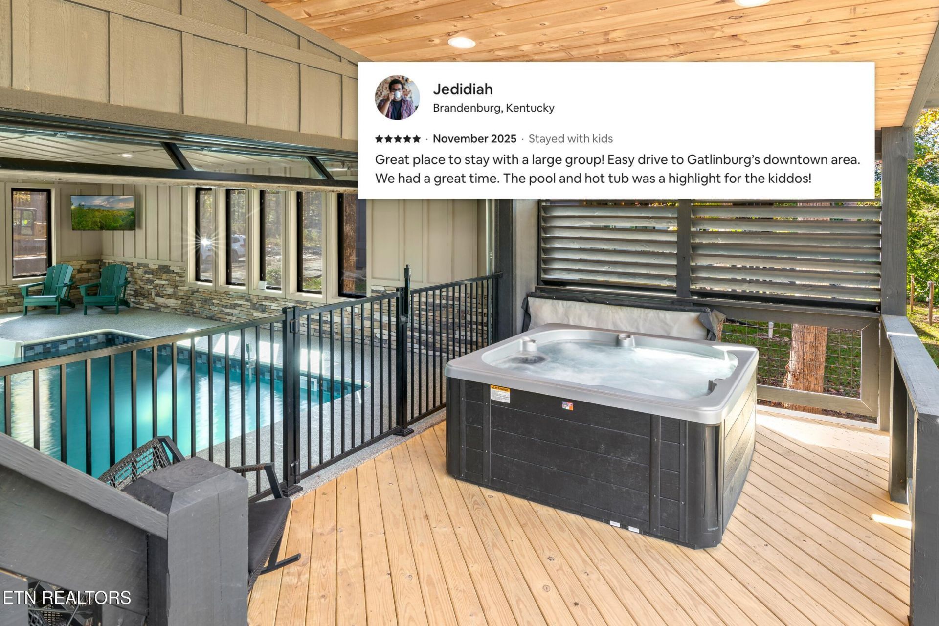 Introducing a 2024 built, modern Smoky Mountain retreat designed to perform at a high level while delivering an unforgettable guest experience. This fully furnished 5-bedroom, 5-bath pool cabin sits creekside in a serene, wooded setting and blends modern design with the natural beauty of the mountains.The property is thoughtfully built for both revenue and reliability, featuring city water and sewer, along with a full indoor sprinkler system for added safety and peace of mind.Inside, the main level opens to a bright, open-concept living space with soaring ceilings, large windows, and a striking two-story stone fireplace that anchors the home. The layout flows seamlessly into the kitchen and dining areas, creating an ideal gathering space for groups.Each of the five bedrooms includes a private ensuite bath with custom-tiled showers, offering comfort and privacy for guests. A charming bonus nook tucked under the stairs adds a memorable touch, especially for families.The standout feature of this cabin is the pool experience. The glass garage-style doors transform the space into a true indoor/outdoor pool, allowing guests to enjoy it year-round while still feeling connected to the outdoors. It is the kind of amenity that drives bookings and repeat stays.Entertainment continues with a dedicated theater room, perfect for movie nights and added guest value.Outdoor spaces are equally compelling. Multiple expansive decks overlook the peaceful creek and wooded surroundings, while the landscaped yard includes a fire pit area that creates a natural gathering spot under the stars. The setting feels private, immersive, and distinctly Smoky Mountain.Located just minutes from Gatlinburg and Pigeon Forge, and less than a mile from Bent Creek Golf Course, the property offers the ideal balance of accessibility and seclusion.This is more than a cabin. It is a purpose-built investment designed to attract high-value bookings, maximize occupancy, and create an experience guests will return to again and again.