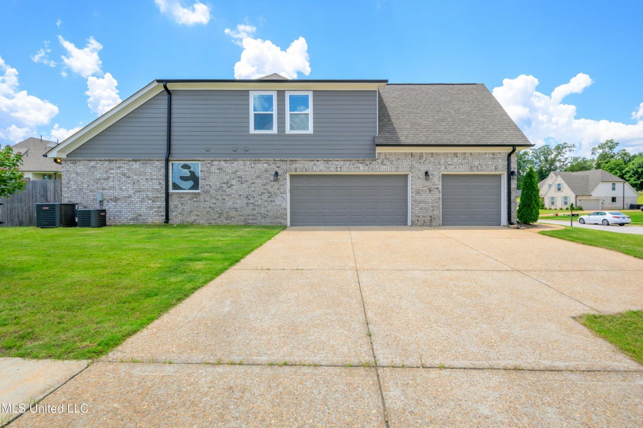 Come check out this Olive Branch beauty. 3 car garage with lots of built in cabinets & storage in garage. Open floor plan - Spacious kitchen made for entertaining. The kitchen features granite countertops, tile backsplash, large island, SS appliances, gas cooktop, double ovens & built in microwave. Separate dining room opens to the living room & kitchen. Beautiful wood floors downstairs. Spacious living room w/gas log fireplace overlooks the back yard. 4 bedrooms, 3 baths w/bonus room. 2 bedrooms down - one would make a perfect in-law wing or office. Large primary suite w/wood accent walls. Primary bath w/2 sinks, separate soaking tub & shower & huge walk in closet that opens conveniently to the laundry room. Drop zone at garage entry door for purses, computer bags & back packs. Better than new construction - 2'' blinds throughout, fenced yard & covered back patio. Large lot w/plenty of flat back yard for playing or future pool or workshop. Enjoy the benefits of a community pool without the maintenance of a pool! This home offers lots of storage & is an entertainer's dream with modern features ideal for today's buyers.
