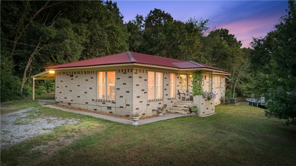 This all-brick home sits on a 0.59-acre hilltop lot with panoramic west-facing Ozark sunset views. Beautiful hardwood floors run throughout the home, including the living room, dining room, and all bedrooms. Large west-facing windows brighten the master, living, and dining areas with natural light and scenic views. The open-concept kitchen, living, and dining spaces create a modern, connected feel. A solid wood front door and well-preserved original tile in both full baths add character and a unique retro touch. Two covered patios provide shaded outdoor living, including one with direct master access and stunning hilltop views. Located within walking distance to a school and park, and offering quick access to 71B and I-49, this property blends privacy, convenience, and charm.