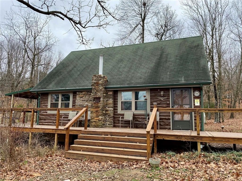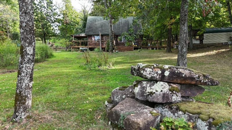 This unrestricted property of over 17 acres offers an exceptional blend of natural beauty, self-sufficiency, and ready-to-use infrastructure, ideal for a private retreat, hunting camp, or long-term investment. At the heart of the land sits a rustic 2-bedroom, 1-bath cabin crafted with native Ozark materials, including stone, cedar, and sassafras harvested directly from the property. Most windows were upgraded in 2024, enhancing natural light, comfort, and efficiency. The cabin serves as a welcoming basecamp for weekend escapes, hunting seasons, or future expansion. The property features electric, water, and multiple utility hookups, including septic access. A spring-fed water system provides a reliable natural source, supported by an on-site 3000 gallon water tank. Additional improvements include a 6'X6' chicken coop, enclosed 60'X60' garden area, a 20'X40' gravel pad with electric, water, and septic hookup, and a 16'X40' dirt pad with electric, water, and filtered rain catch system.