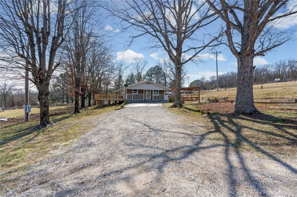 This charming 3 bedroom 1 bath home with a basement level has a newer A/C unit, new water heater, wood cabinetry, gazebo and new deck built on January 2025 sits on 2.53 acres. Back porch has beautiful views of War Eagle Valley. The front of property has some highway road frontage. This home also features a detached 1,110 sqft shop with a front end alignment rack, welding plug, and electrical on site. Great for handyman. Home is located right off HWY 412 Business not far from new development and minutes away from Walmart and Huntsville Schools. This home is about 1 hour from Branson and about half hour from Fayetteville and Eureka Springs.