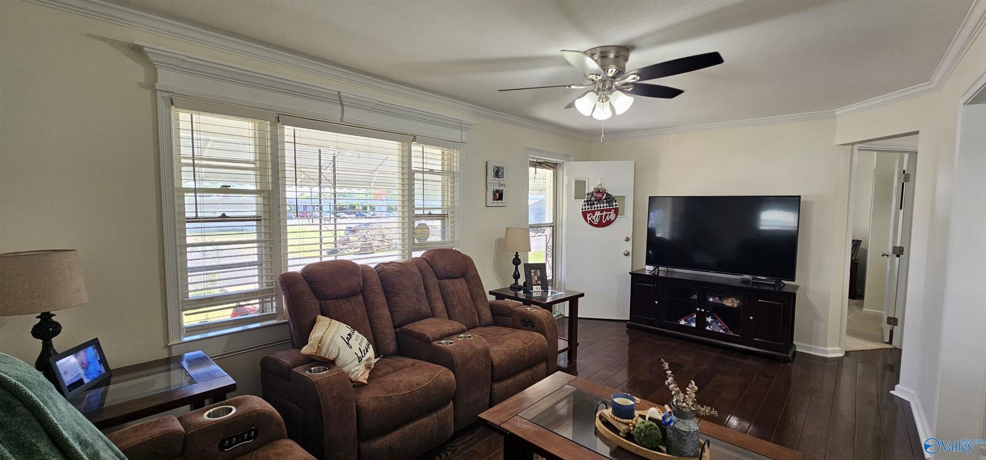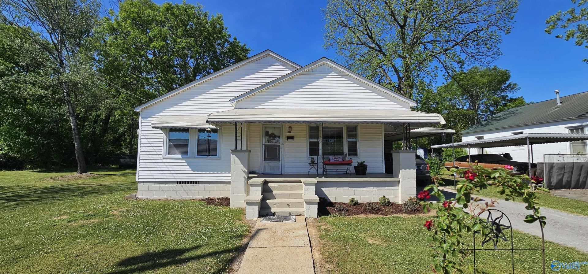 Welcome home to this lovely 3 bed 1 bath traditional style home featuring beautiful metal awnings that give this home a classic feel. This home was updated in 2025 to include new roof and 3/4 in Mocha hardwood floors and Shaw elevate carpet with spill trap padding. There is a 23 X 27 Garage/Workshop in the back with 110 and 220 electric. There is also a gutter on shop that runs to a water holding tank allowing you to give your flowers a nice drink of rainwater. Nice open covered carport area with enough room for your boat and truck. Crown molding and decorative trim providing a nice finishing touch. Less than a minute from the Unclaimed Baggage Center and minutes to downtown Scottsboro.