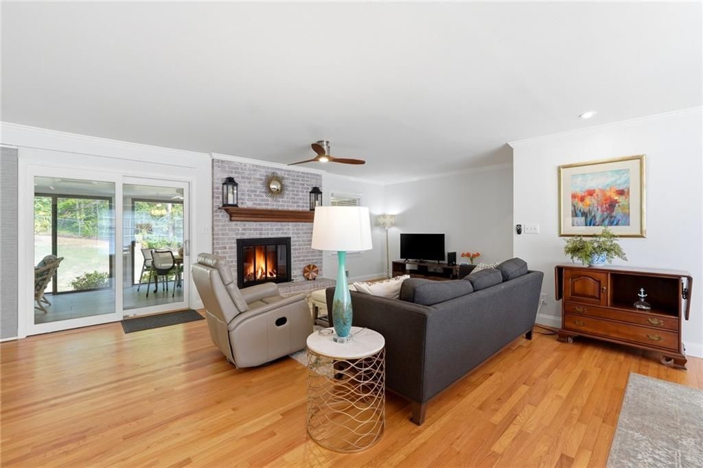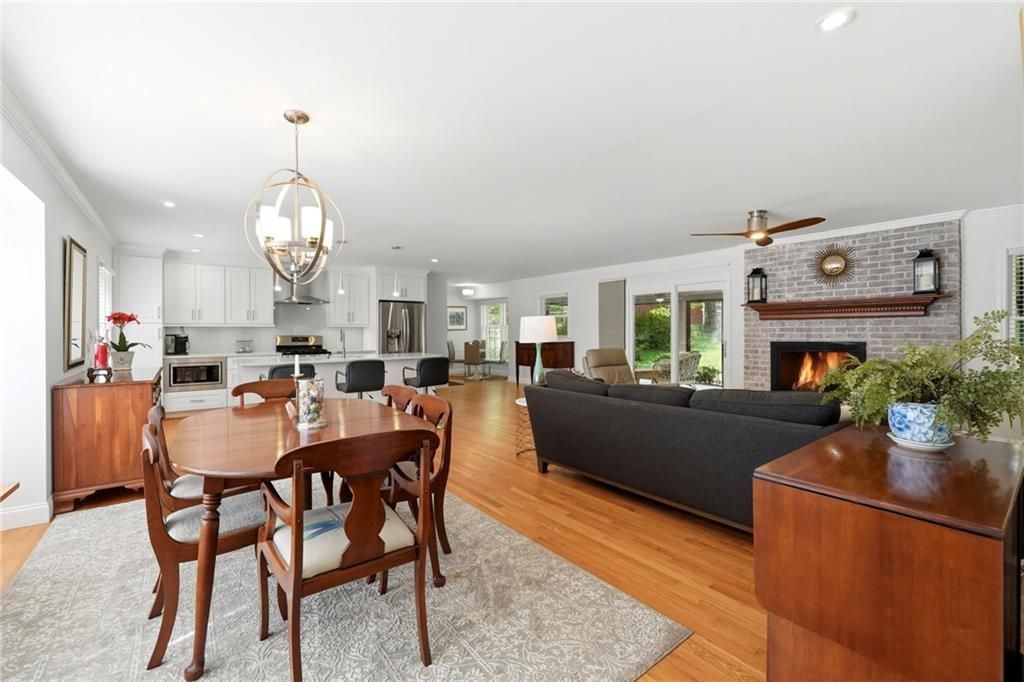 Beautifully renovated brick ranch in the heart of Dunwoody offering the ideal combination of modern updates and comfortable single-level living. This move-in ready home features an open-concept layout connecting the living room, dining area, and kitchen, highlighted by refinished hardwood floors, updated lighting throughout, and a welcoming brick fireplace that serves as a warm focal point for the main living space. The updated kitchen showcases white shaker cabinetry, quartz countertops, stainless steel appliances, gas range, designer vent hood, tile backsplash, and a spacious island with seating, creating a stylish and functional space for everyday living and entertaining. Just off the kitchen, a versatile flex area near the laundry room offers options for a breakfast nook, small office, or additional organizational space. A standout feature of the home is the expansive all-seasons porch spanning nearly the full length of the rear of the house. Fully enclosed with sliding glass doors, this bright and inviting space allows for year-round enjoyment while overlooking the large fenced backyard. The yard features a chain link fence with both a single gate and double gate, offering flexibility for access and providing sufficient space for boat or RV storage if desired. All three bedrooms are thoughtfully located on one side of the home. The primary suite features an updated ensuite bath with walk-in shower and modern finishes, while the two secondary bedrooms share a renovated hall bath with tub/shower combination, updated vanity, and contemporary tile. The large unfinished basement offers excellent storage and workspace options and includes both interior and exterior entry. Additional features include a two-car garage and a highly functional layout designed for everyday convenience. Located in a desirable Dunwoody area known for strong schools, convenient access to shopping and dining, and proximity to major commuter routes, the property also benefits from no HOA restrictions ? a rare opportunity in this sought-after location.