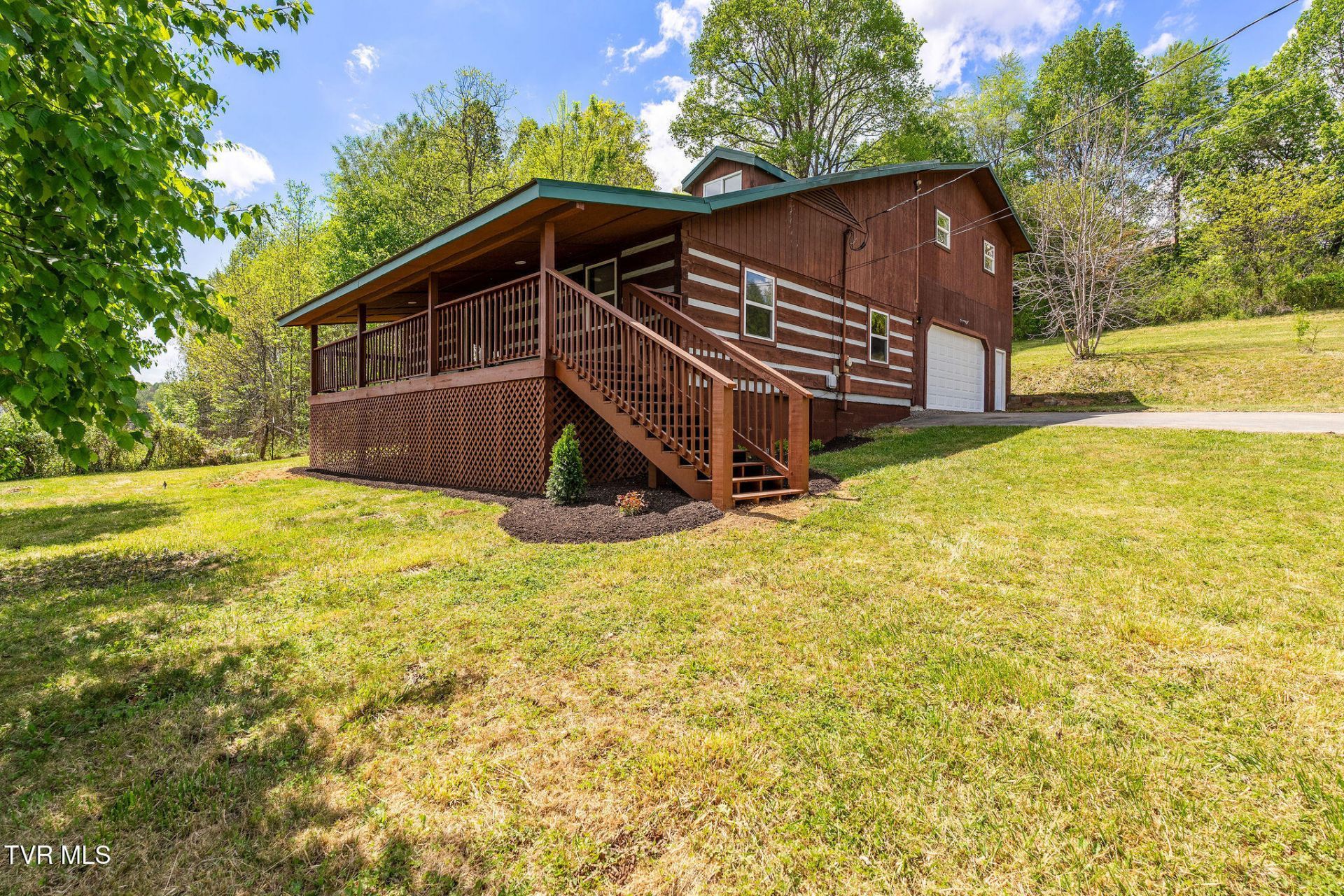 Set on 3.23 private acres just minutes from Johnson City, this stunning 2016 Sq Ft log style home offers the perfect blend of rustic charm and modern upgrades in a peaceful, scenic setting. A full length covered front porch spans the entire front of the home and captures beautiful valley views, creating an inviting space to relax and unwind. Step through the double glass front doors into a bright open interior with soaring vaulted ceilings, rich wood flooring, and exposed timber accents that bring warmth and character throughout the main living areas.The main level features an open concept design with a spacious kitchen complete with brand new appliances, two generously sized bedrooms, a large full bathroom, and a convenient laundry room located within the home. Upstairs offers an expansive second living area that opens directly to a private back deck overlooking the property, providing endless flexibility for a second family room, game room, or entertainment space. Two additional bedrooms with walk in closets and a full bathroom complete the upper level, creating an ideal layout for guests, extended family, or a potential separate living space.The oversized two car garage is massive and offers incredible space for multiple vehicles, a workshop, storage, or hobby use. The home is equipped with dual HVAC systems with one unit servicing the main level and a separate unit for the upper level, providing efficient and comfortable climate control year round. Recent upgrades include new luxury vinyl plank flooring throughout the upstairs, fresh interior paint, updated fixtures, and modern finishes that make this home truly move in ready.The acreage offers exceptional usability with a barn and plenty of open space to bring your vision to life whether it is for animals, recreation, gardening, or future improvements. The long asphalt driveway provides abundant parking and enhances the sense of privacy while still being conveniently located near town. This is a rare opportunity to own a spacious, beautifully updated home with land, versatility, and endless potential in a highly desirable location. Homes like this do not come available often and this one is ready to sell quickly.