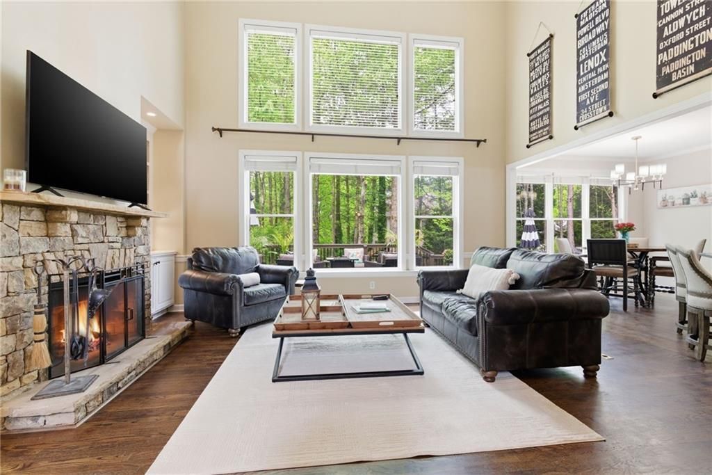 Beautiful 3-sided brick home in the highly sought-after Creekside community, located in the Estate section and within a top-rated Forsyth County school district. The main level features an updated kitchen with leathered granite countertops and seamless flow into the living spaces, highlighted by a dramatic two-story wall of windows, built-ins, and a custom stone fireplace. A separate dining room, private office, and guest bedroom with full bath complete the main floor. Upstairs, the spacious primary suite offers a spa-like bathroom and a sitting area with private balcony access overlooking the wooded backyard. Multiple closets provide abundant storage. Two secondary bedrooms share a Jack-and-Jill bath, while an additional bedroom features its own private en-suite. All bedrooms and the upstairs feature new carpet. The finished terrace level includes a family room, media room, bedroom, full bath, workshop, and generous storage space. Enjoy one of the best backyards in the neighborhood, featuring an oversized two-level deck, a screened-in three-season porch, and a firepit - perfect for relaxing or entertaining. Creekside offers resort-style amenities including a clubhouse, fitness center, pool, tennis courts, pickleball courts, and playground. Ideally located within walking distance to shopping, dining, and New Hope Elementary School, and just minutes from Georgia 400, Big Creek Greenway, additional shopping and dining and Northside Hospital Forsyth.