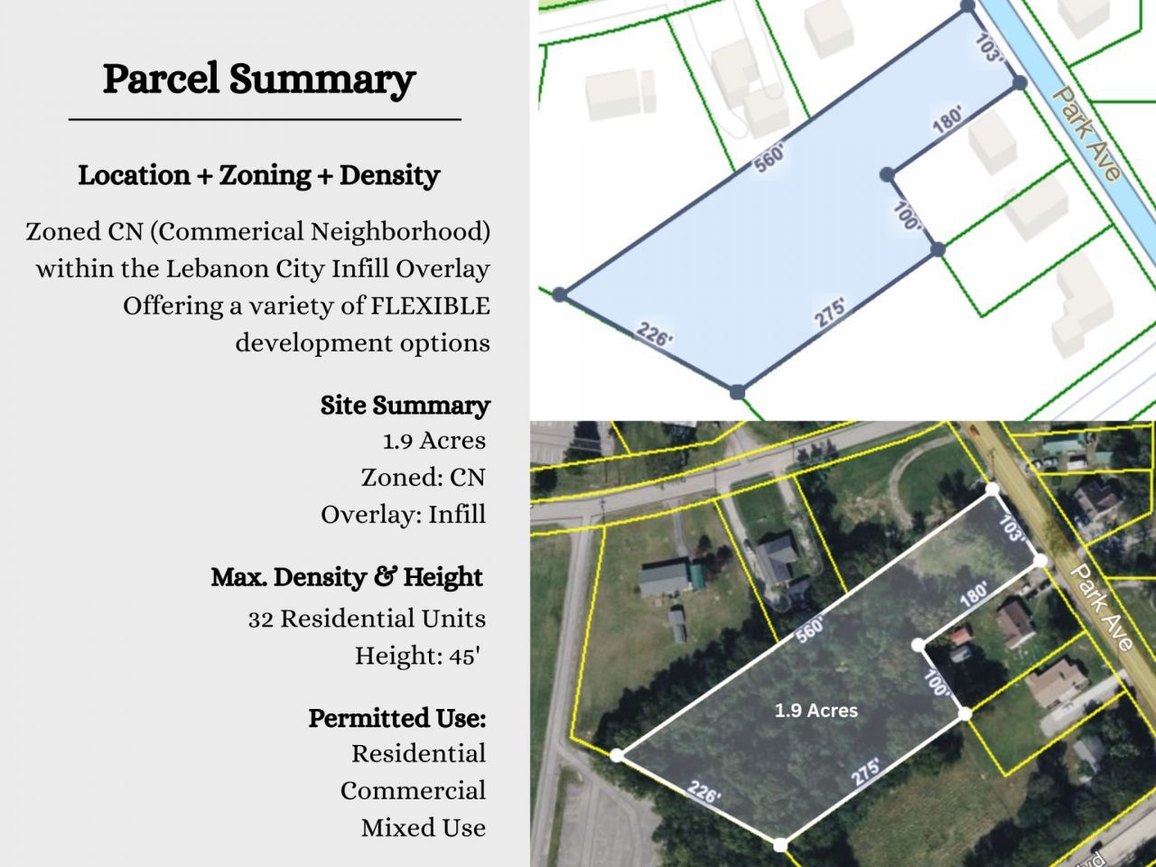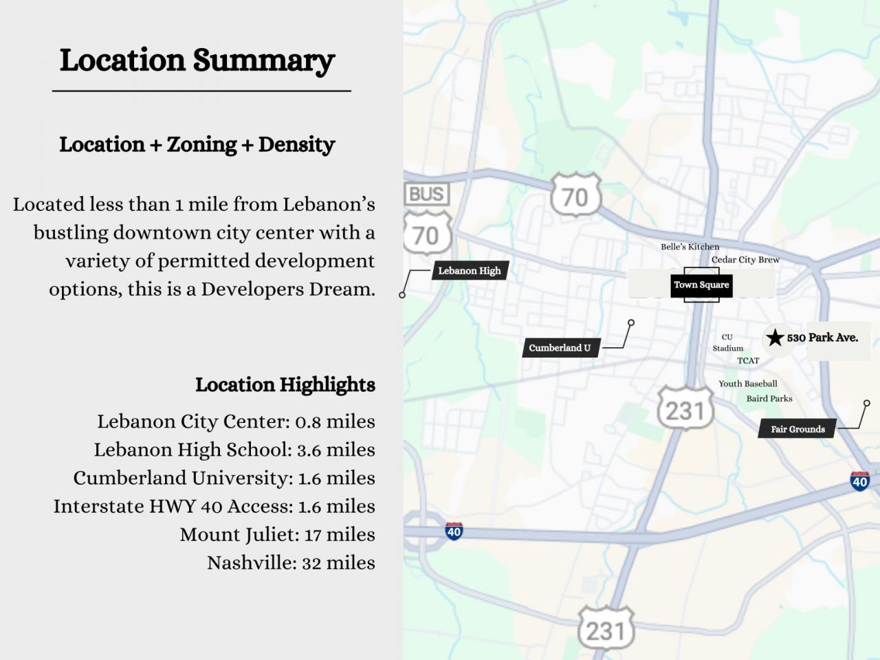 Attention Builders, Developers and Investors! This prime 1.93 acre parcel offers Location + Zoning + Density. Located just blocks from Lebanon's bustling Town Square AND zoned CN (Commercial Neighborhood) within the city's Residential Infill Overlay District. Flexible CN zoning permits a wide range of development options, including Residential and Commercial Mixed Use. Max density permits up to 32 residential units. Adjacent to Vanderbilt's Wilson County Hospital McFarland campus, Cumberland U Rudy School of Nursing and the TCAT campus. Just minutes from Lebanon High, the Wilson County fair grounds and HWY 40 interstate access. This is an intriguing Investor/Developer opportunity. Boundary survey available upon request. Additional parcels may be available for larger tract.