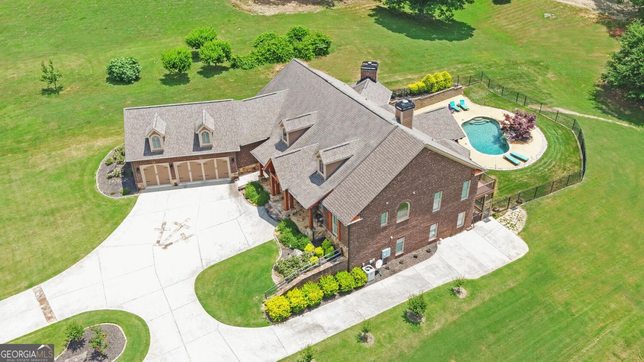 Luxury 4-sided brick estate on 2.3 private acres in sought-after Mount Vernon Preserve and the North Hall School District. This meticulously maintained home offers estate-sized living with a saltwater Gunite pool featuring a waterfall, expansive covered and screened composite decks, and wood-accented gables that showcase the rear elevation beautifully. The inviting rock front porch opens to a grand foyer with soaring vaulted ceilings extending through to the covered back porch. The thoughtfully designed split-bedroom floorplan includes a formal dining room, a keeping room with wood-accented ceilings and fireplace, a formal living room with detailed trim and a second fireplace. The chef's kitchen features a dual-fuel range, abundant cabinetry, large pantry, and an adjoining eat-in area. The spacious primary suite offers a sitting area with private deck access, dual vanities, separate tub and shower, and tile flooring. Two secondary bedrooms share a Jack-and-Jill bath, and a dedicated office with built-ins provides excellent workspace. The terrace level is ideal for multi-generational living or entertaining, offering a full kitchen, private bedroom suite, flex space, workout room, pool-access bath, and separate exterior entrance. Outdoor living is exceptional with covered and screened patios, composite decking, and a beautifully landscaped Bermuda lawn. Additional features include a security camera system and extensive storage. Estate-sized lots and limited traffic provide privacy and tranquility in one of North Hall's most desirable communities. The back porch has brand new Composite decking and is ready for you to enjoy.
