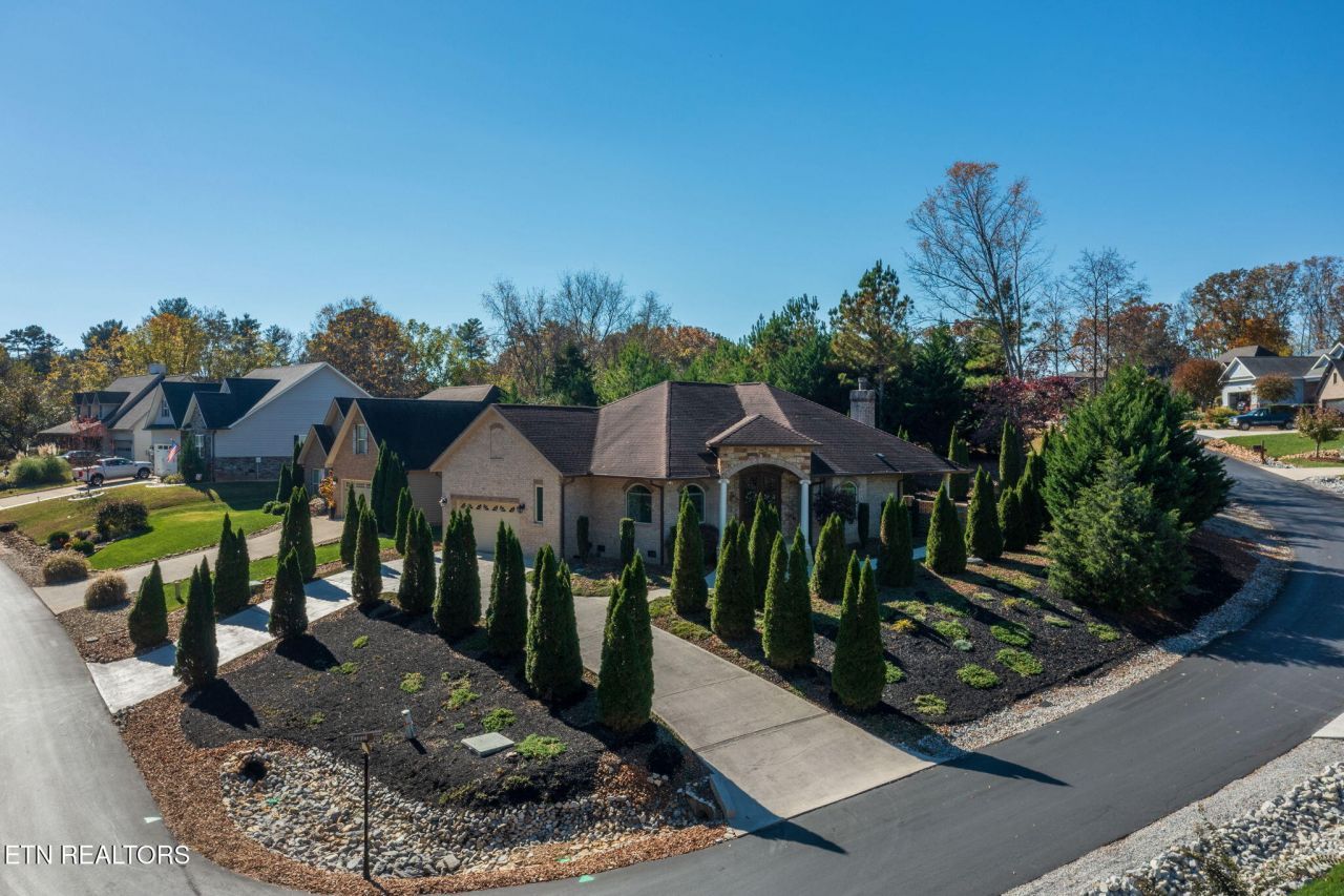 Here is a rare opportunity to own a beautiful, Custom-crafted builder's home in the highly desired and peaceful Tanasi Shores neighborhood on the north end of Tellico Village-with no traffic noise and exceptional privacy.This stunning one-level, all-brick home with stone accents offers outstanding curb appeal and low-to-no-maintenance living with no mowing, making it ideal for relaxed retirement or easy everyday living. Situated on a coveted corner lot with a circular drive, the home is located across from the lake, offering partial seasonal lake views. Additional side and backyard parking adds convenience for guests.Guests are welcomed by a towering stone-covered arched portico with classic marble-tiled, extra-wide steps and a spacious landing. An extraordinary mahogany double door with wrought iron accents sets the tone for the exceptional craftsmanship found throughout the home.Inside, enjoy solid hardwood flooring throughout-no carpet-and the luxury of heated flooring in all three bathrooms. The thoughtfully designed floor plan flows beautifully, offering comfortable everyday living while providing ample space for family gatherings and visitors. Custom woodwork, elegant finishes, Hunter ceiling fans, accent lighting, and dimmers enhance every room.The heart of the home features a spacious eat-in kitchen and cozy keeping room, complete with stainless steel appliances, granite countertops, designer custom cabinetry, pantry, counter-height island seating, fireplace, and direct access to an outdoor dining area. This expansive kitchen offers flexibility to suit a variety of lifestyles and entertaining needs.The primary suite is a true retreat, featuring double-door entry, a bay window overlooking the private courtyard, and a luxurious ensuite with jetted soaking tub, walk-in shower, dual vanities, and a generous walk-in closet. Additional spaces include two guest bedrooms, a multipurpose office, a full guest bath, and a dedicated laundry room. The oversized double-height two-car garage includes mounted adjustable overhead storage racks.Step outside to a truly serene outdoor living retreat, featuring a spacious private courtyard, covered and tiled patio with gate, elegant walkways, and lavish, professionally designed landscaping offering year-round color and delightful blooming surprises throughout the seasons-creating a peaceful Zen-like atmosphere.This home was constructed with purposeful energy efficiency, including 2x6 framing and insulation, custom windows and blinds, double-insulated easy-roll UV-tinted windows, and quality materials throughout.Located in the award-winning Tellico Village golf and lake community, nestled in the foothills of the Great Smoky Mountains, this home is truly unique, thoughtfully designed, and exceptionally special.