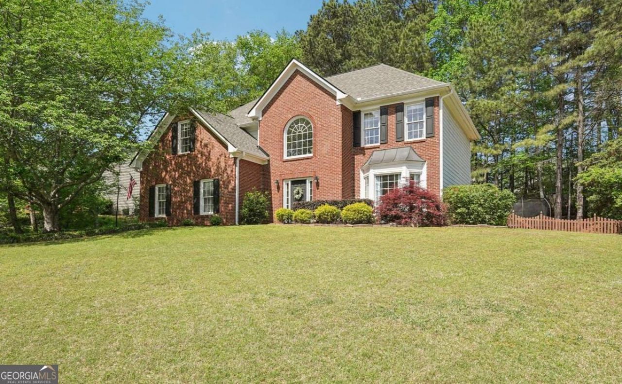 Nestled on a beautifully landscaped wide lot surrounded by mature trees, this stately two-story brick home offers timeless curb appeal paired with well-updated interiors. Step inside to a dramatic two-story foyer filled with natural light that enhances the home's airy, open feel. Light vinyl flooring and neutral tones throughout provide a warm yet modern backdrop. The main living area is designed for both comfort and entertaining, featuring a spacious family room with custom built-in shelving and a central fireplace. Expansive windows line the back wall, bringing in abundant daylight and offering peaceful views of the wooded backyard. The open-concept layout seamlessly connects the living room to the kitchen and breakfast area. The kitchen is bright and functional, showcasing crisp white cabinetry, quartz countertops, a center island, and stainless-steel appliances. Additional main-level living space includes a versatile sitting room along with a dedicated dining room-perfect for gatherings or more intimate occasions. Upstairs, the generously sized primary suite features vaulted ceilings and a flexible sitting or workspace area. The en-suite bathroom includes dual vanities, a soaking tub, separate glass-enclosed shower, and abundant natural light, creating a relaxing retreat. Throughout the home, large windows frame tranquil outdoor views, reinforcing the sense of privacy and connection to nature. The backyard is wooded and peaceful, offering wonderful outdoor living, recreation, or quiet enjoyment. Recent improvements include a newly installed roof as well as replacement of both HVAC systems, adding value and reflecting the home's exceptional level of maintenance and pride of ownership.