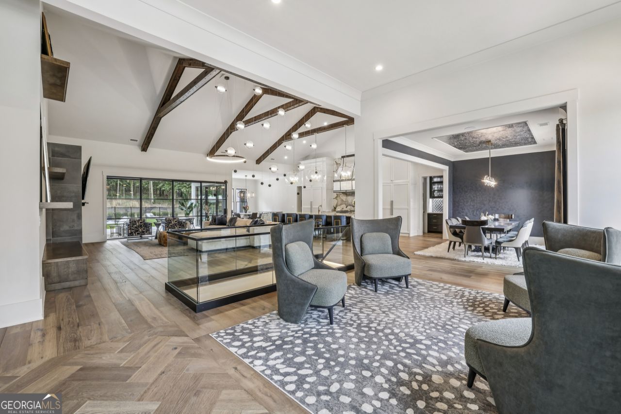 Modern luxury meets effortless living in this fully renovated gated estate, ideally positioned on 2.3 private, level acres in the heart of Sandy Springs. Designed for seamless main-level living, the home blends architectural sophistication with warm, livable elegance. The chef's kitchen impresses with a dramatic waterfall island and premium finishes throughout. Retractable doors in the living room open completely to the outdoors, blurring the line between inside and out and creating the ultimate indoor-outdoor lifestyle. Resort-caliber outdoor spaces create a true retreat - featuring a sparkling pool, expansive covered porch with fireplace, grilling terrace, and beautifully landscaped grounds that offer privacy and year-round enjoyment. Inside, a light-filled open floor plan is defined by soaring ceilings, wide-plank hardwood floors, curated designer lighting, and custom millwork throughout. Every space feels intentional, elevated, and effortlessly connected. The chef's kitchen is both striking and functional, appointed with a commercial-grade gas range, premium stainless appliances, scullery, and an oversized island that flows seamlessly into the fireside great room - creating the ultimate setting for everyday living and entertaining alike. The primary suite serves as a serene private retreat, complete with a sitting area, custom walk-in closet, and a spa-inspired bath featuring double vanities and a statement wet room with a frameless glass shower. A private guest suite offers its own sitting area and en-suite bath, while two additional bedrooms include walk-in closets and beautifully appointed baths. The thoughtfully curated main level showcases refined architectural details and bespoke finishes throughout. A banquet-sized dining room with hand coiled ceilings sets the stage for elegant gatherings, while the private study offers a sophisticated workspace enhanced by tailored built-ins. The inviting keeping room provides warmth and versatility, seamlessly complementing the home's open living spaces. A spacious bonus recreation room on the main level adds flexibility for media, play, or casual entertaining. Function meets luxury in the beautifully designed mudroom and laundry suite, featuring custom cabinetry, stone countertops, generous workspace, and a built-in dog wash - a polished yet practical amenity tailored for modern lifestyles. A dedicated pool bath and elegantly appointed powder room further enhance the home's seamless indoor-outdoor living experience. Above the second garage, a private bonus suite with full bath offers exceptional versatility - ideal for a golf simulator, fitness studio, media lounge, or creative space. The terrace level expands the living footprint with a fifth bedroom, seventh full bath, secondary family room, wet bar, a secret whiskey tasting room, and generous storage. All of this in an unbeatable location just moments from Sandy Springs' premier dining, shopping, and top-rated schools - a rare opportunity to own a truly turnkey estate where design, comfort, and location converge.
