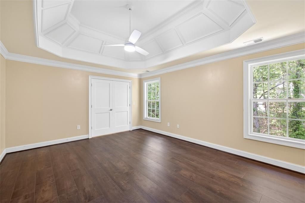 Welcome to Windsor at Lanier. This beautifully appointed 5-bedroom, 3.5-bath home just minutes from Lake Lanier, nestled in a highly sought-after swim/tennis community! This spacious residence offers the perfect blend of elegance, comfort, and versatility. Step inside to the gleaming LVP flooring flowing throughout the main and upper levels! Charming and elegant foyer with extensive trim work. To the right you will find a beautiful and bright formal dining room with wainscoting and gorgeous chandelier. Across the foyer you will find a welcoming sitting room, would be a great office, with incredible natural light with views into the generous living room featuring a grand wood-burning fireplace with a marble surround. The kitchen is a true highlight, featuring crisp white cabinetry, quartz countertops, custom tile backsplash, and stainless steel appliances?perfect for both everyday living and entertaining. Enjoy the brand NEW deck with peaceful wooded view with the light sounds of the creek, perfect way to start or end your day! Head upstairs with a breathtaking coffered ceiling loft area and gleaming LVP flooring flowing throughout the upper level. The luxurious primary suite impresses with a vaulted ceilings and custom crown molding, while the spa-like bath features a custom design with heated tile floors, a soaking tub, and a tiled frameless glass shower. There are 3 additional spacious secondary bedrooms are also sure to please with ample closet space and natural light. Down the hall is a full custom bathroom with double vanity sinks, custom tile floor and private water closet for additional privacy! Head down to the fully finished terrace level, ideal for multi-generational living or entertaining, complete with a full kitchen, private bedroom, living room, office/ game room, a newly updated full bath and so much more! Enjoy peaceful mornings or evening gatherings on the covered patio overlooking a serene wooded view. This location is incredible with being less than 10 minutes from Lake Lanier, shopping, restaurants, schools and so much more!