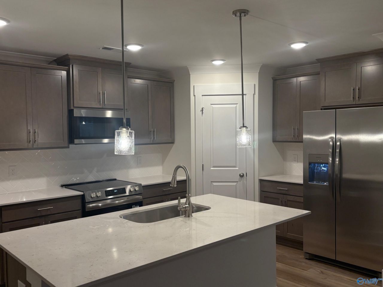 Move-in ready! Experience cozy, elevated living in this Daphne plan, loaded with upgrades! The open layout features LVP flooring throughout, quartz counters, Craftsman trim, cove crown molding, & a cozy gas fireplace. The primary suite offers a tile shower with bench, & the laundry room includes cabinets for extra storage. Eave lighting adds charm, & the stainless fridge, washer, dryer, & tankless water heater make this home truly move-in ready. A perfect blend of comfort & style! Enjoy outdoor living on the covered back patio overlooking the spacious corner lot! 15 min. to Guntersville Lake/25 min. to Hsv/nearest RSA gate. *48 HR First Right of Refusal