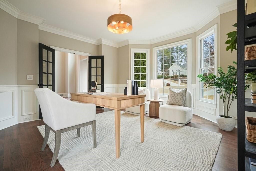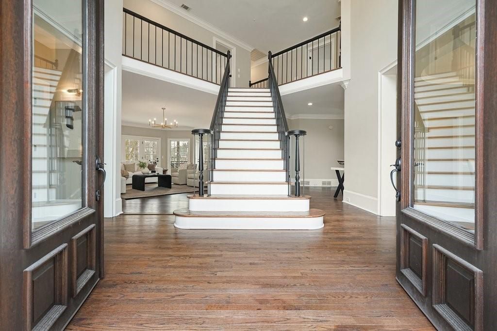 Exceptional opportunity to own on the 6th green in the prestigious Polo Golf & Country Club. This stunning estate offers sweeping golf course views and luxury living across three finished levels. Newly renovated with modern, high-end finishes, the home perfectly blends grand scale and timeless detail in one of Cumming's most sought-after golf communities. From the moment you arrive, the circular driveway and commanding 8-foot double entry doors create an undeniable presence. Inside, a breathtaking two-story foyer with a grand staircase and statement chandelier sets the tone for the entire home. Rich hardwood flooring flows throughout the main level and into the expansive primary suite. The main floor is thoughtfully designed for elevated, effortless living, featuring a private office, formal dining room with butler's pantry, chef's kitchen with island, breakfast area, walk-in pantry, laundry room, powder bath, and an inviting living room framed by panoramic golf course views. Both the living room and breakfast area open to the main-level covered porch, creating seamless indoor-outdoor living, while the office also enjoys access to this peaceful outdoor space overlooking the fairway. The primary suite is a retreat of its own. Spanning nearly 1,000 square feet, it serves as a private sanctuary with a sitting area, spa-inspired bath featuring dual vanities, soaking tub, and seamless glass shower with double shower heads, along with a generous walk-in closet featuring a custom closet system and space for the addition of a secondary washer and dryer. The suite extends onto a covered upper-level porch capturing sweeping golf course views and stunning sunsets. The home's upper level also includes three large secondary bedrooms, each with its own walk-in closet and direct bathroom access, including one with a private en-suite bath, while the remaining two share a Jack-and-Jill bath. The fully finished terrace level is designed for entertaining and flexible living, featuring a living area with dedicated sitting and dining spaces and a built-in bar. This level offers an additional bedroom and full bath, plus multiple rooms ideal for a gym, office, or flex space. The walk-out terrace level also provides direct backyard access. Outdoors, the property features a sodded front and backyard, elevated black aluminum fencing, and an irrigation system for easy maintenance. The expansive backyard offers ample space to add a pool, putting green, or design your own custom outdoor retreat while enjoying unmatched views. Don't miss this rare turnkey opportunity on one of the most desirable golf course lots.