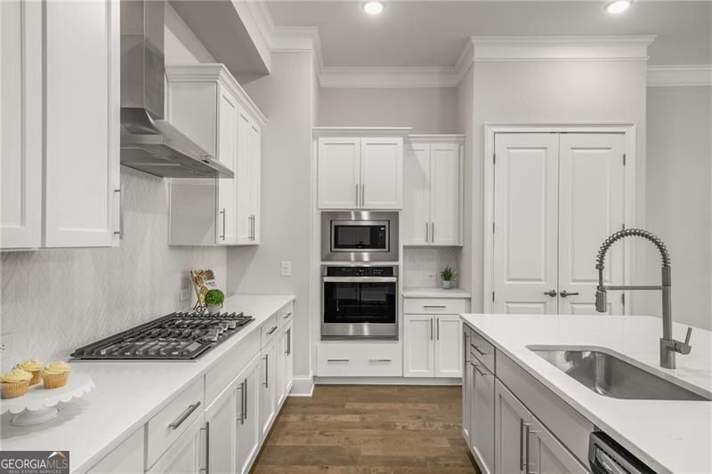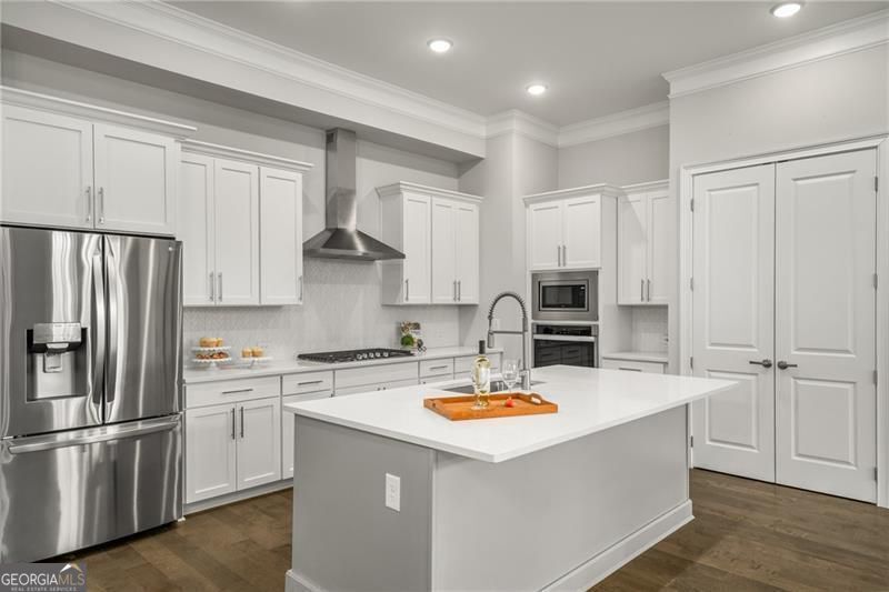 Better than NEW!! The Perfect home in the perfect location!! When you step into The Frisco, you'll feel right at home with its modern and stylish layout, 10ft ceilings and hardwood floors thru-out. The open-concept kitchen/dining/family room will ensure you'll have plenty of space for entertaining and relaxing. The kitchen features an oversized island with beautiful quartz countertops, soft close cabinetry and stainless steel appliances ensuring a dream culinary experience. Don't miss the custom closet walk-in pantry. Bright open family room features a gorgeous linear fireplace and wall of windows. Upstairs, you'll find the secluded large owner's suite complete with walk-in custom closet designed by Spacemakers, large spa-like ensuite bathroom with separate vanities and gorgeous glass framed shower. Relax on the private covered deck just off your Owner's Suite for your morning coffee. Just down the hall are two more spacious bedrooms each with walk-in closets and an additional bathroom. But we're not finished yet! This home features a private fenced backyard with woods behind. More bonus features -- additional parking across the street for guests. This home has all the upgrades - wide plank engineered floors, designer tile, stainless steel appliances including refrigerator and W/D, lighting, quartz counters, custom closets! Hurry to see this meticulously maintained home just minutes to vibrant downtown Woodstock's many dining, shopping and entertainment amenities. Come tour this beautiful home and see the ease of lock and go living!