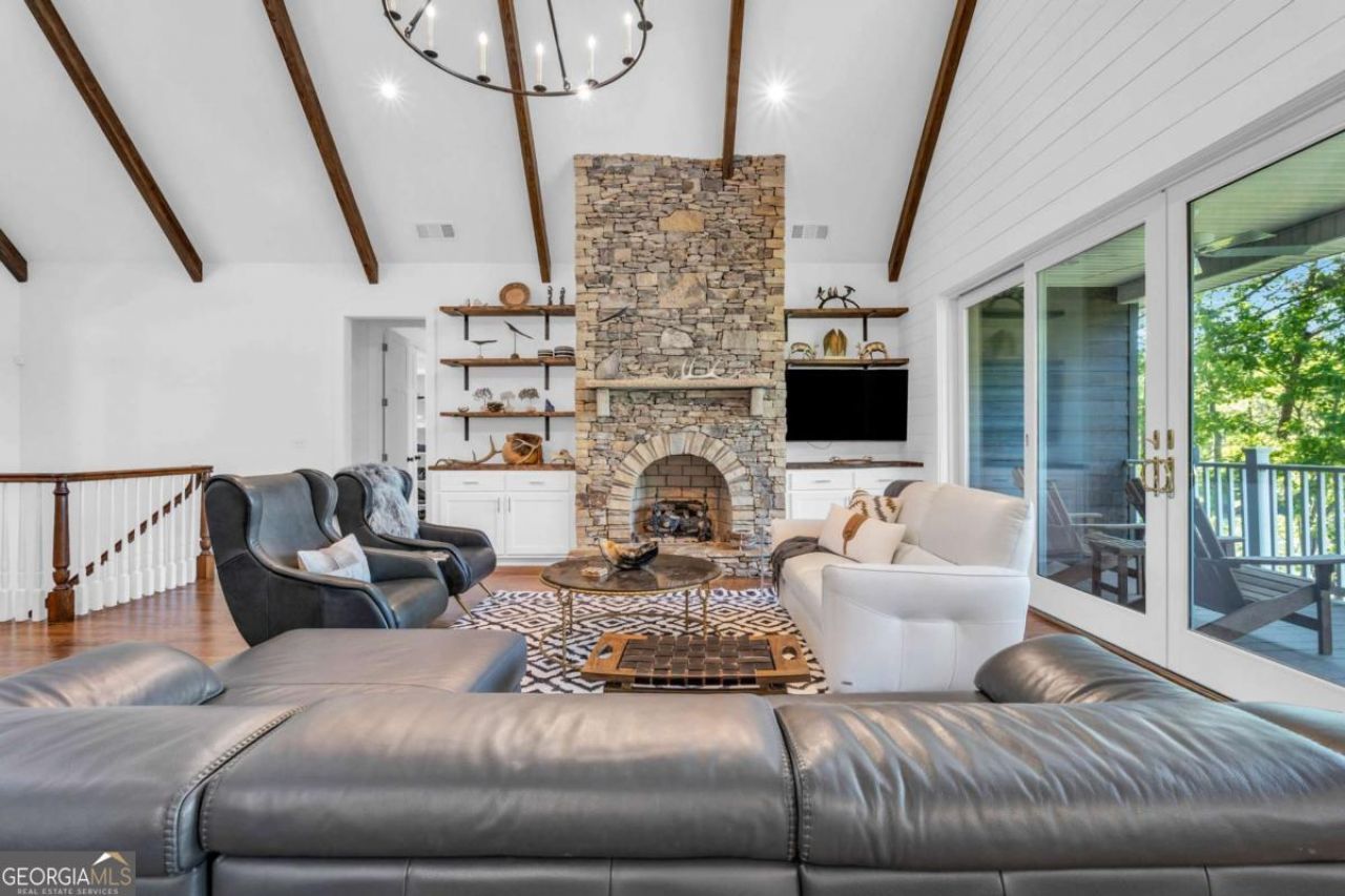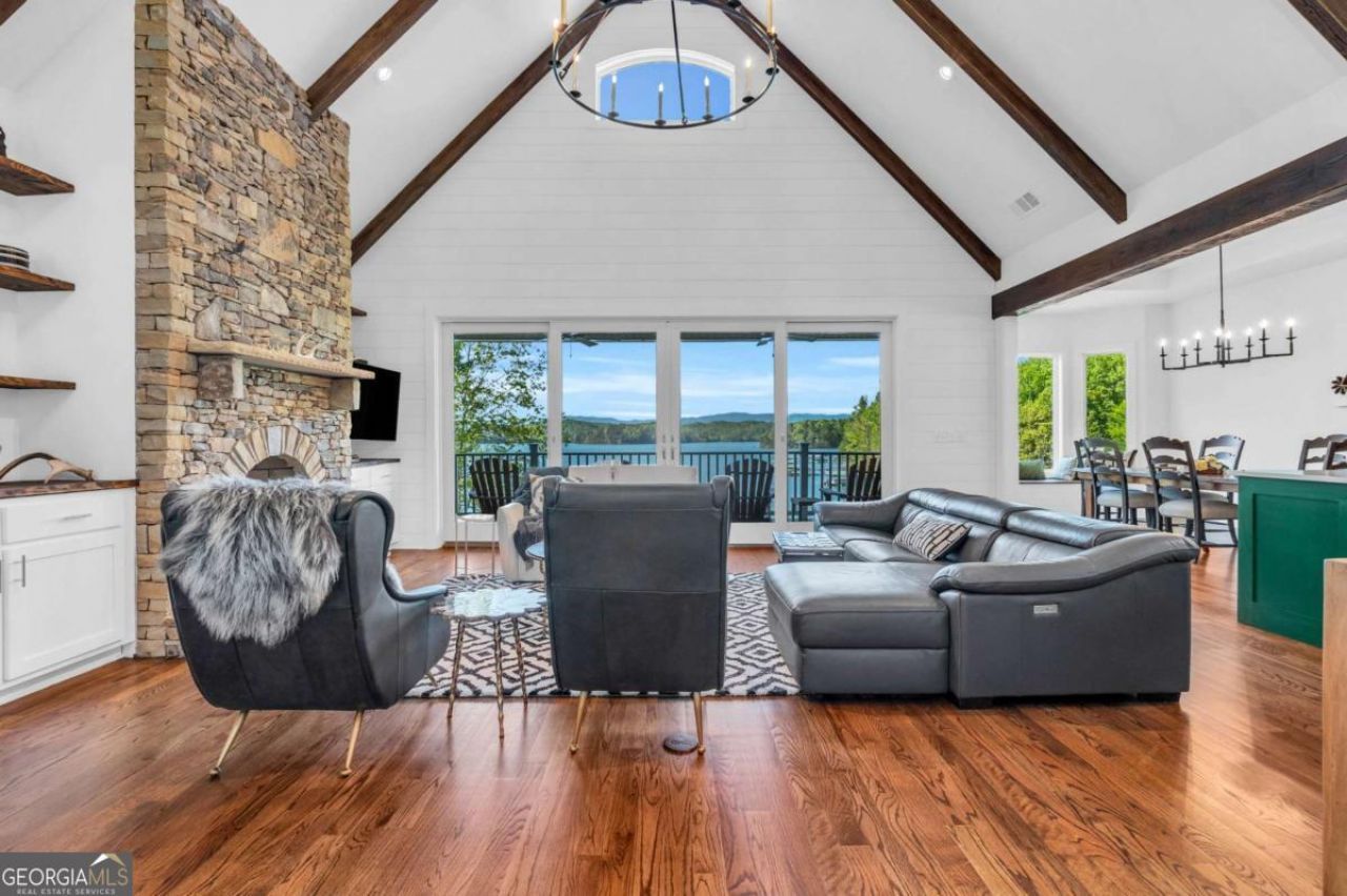 Positioned to capture sweeping panoramic views of the lake and surrounding mountains, this exceptional North Georgia lakefront residence offers a rare combination of refined design, privacy, and effortless waterfront living. Offered mostly furnished to complement the home's design, the property is thoughtfully arranged to maximize views from nearly every room and create a seamless connection between indoor and outdoor spaces. The main level features vaulted ceilings, custom millwork, and an expansive wall of windows that fills the space with natural light while framing the surrounding landscape. The open-concept layout connects the living area to a well-equipped kitchen with stainless steel appliances, a walk-in pantry, and two dining spaces, including a window seat overlooking the water. The owner's suite offers a private retreat with direct access to a covered deck, along with a well-appointed bath featuring tile flooring, a walk-in shower, steam shower, and a spacious closet. Additional main-level elements include a powder room, laundry room, and attached two-car garage. The terrace level provides additional living space with a fireplace, wine bar, and a large gathering area that opens to a covered patio with a built-in grilling station. Two guest suites and a flexible bonus room offer versatility for guests or a home office. A walkway leads to the private dock, complete with a recently added boat lift, and a 2022 Star Coast SLS-3 boat is included and stored nearby for convenience. The property also includes dedicated storage, plantation shutters, wood and tile flooring, and an irrigation system. A distinctive lakefront offering that must be experienced in person to fully appreciate its setting, design, and views.