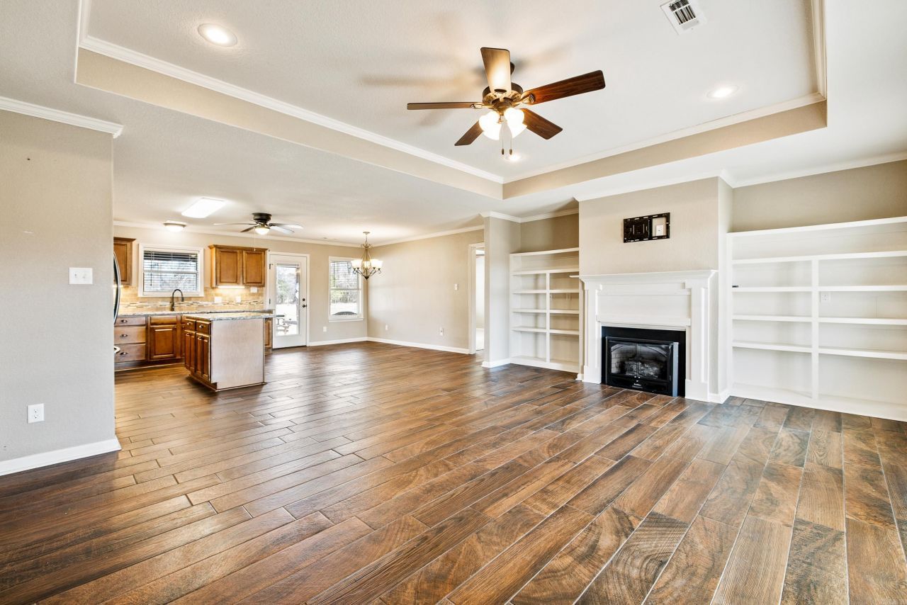HOME ON 3 FLAT ACRES WITH HUGE SHOP! This beautifully maintained home offers elevated country living with a peaceful wooded backdrop. The open living area features tile flooring, custom built-ins, and a propane gas fireplace, flowing into a well-appointed kitchen with granite countertops, stainless steel appliances, double oven, and refrigerator that conveys. A split floor plan provides privacy, while the laundry room is thoughtfully designed with a sink and folding table. The primary suite is a true retreat with double vanities, jacuzzi tub, walk-in shower, and walk-in closet with a built-in wall safe. Enjoy the large covered porch, plus a new roof in 2023, brand-new hot water heater, and full guttering. The 42x40 Red Iron shop is equipped with electricity and plumbing, includes an interior workshop, and offers two bays???one oversized and ideal for RV parking. This rare find won't last long!