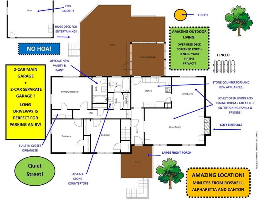 COMING SOON! NO HOA! 4+ CAR PARKING! Nestled between Milton, Roswell, and Canton, this property sits at the end of a long private driveway in an established neighborhood, offering exceptional privacy paired with unmatched convenience. Located just seconds from major corridors, you'll enjoy quick access to Downtown Woodstock, Roswell, Milton, and Canton. The interior has been thoughtfully updated with custom cabinetry and light granite countertops in both the kitchen and secondary bathroom. The Owners' Bedroom, with an en Suite full bath, includes a new, updated vanity! Lovely Engineered Hardwood flooring flows throughout the home. Spacious secondary bedrooms. You'll LOVE the Screened Porch and oversized deck overlooking the private, fenced yard?perfect for outdoor living and entertaining. An additional detached two-car garage offers endless possibilities for a workshop, workout area, craft area, and more. With no HOA restrictions, you also have the flexibility to use the home as an Airbnb or rental. New Roof/Gutters 2020. ROOM FOR AN RV ON THE DRIVEWAY! GREAT LOCATION! SEQUOYAH HS DISTRICT! ** COMING SOON WITH SHOWINGS TO START ON FEBRUARY 17, 2026 **.