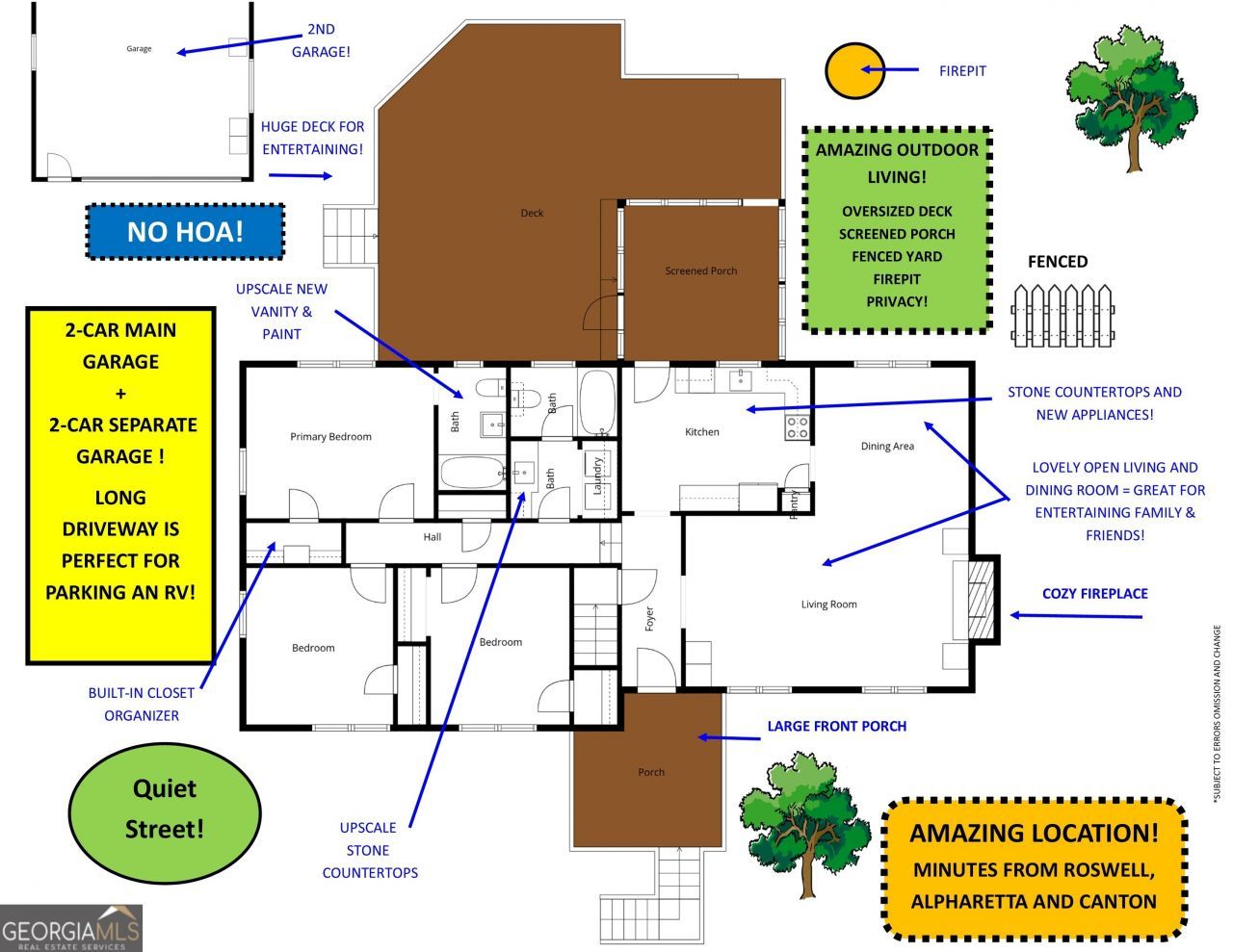 COMING SOON! NO HOA! 4+ CAR PARKING! Nestled between Milton, Roswell, and Canton, this property sits at the end of a long private driveway in an established neighborhood, offering exceptional privacy paired with unmatched convenience. Located just seconds from major corridors, you'll enjoy quick access to Downtown Woodstock, Roswell, Milton, and Canton. The interior has been thoughtfully updated with custom cabinetry and light granite countertops in both the kitchen and secondary bathroom. The Owners' Bedroom, with an en Suite full bath, includes a new, updated vanity! Lovely Engineered Hardwood flooring flows throughout the home. Spacious secondary bedrooms. You'll LOVE the Screened Porch and oversized deck overlooking the private, fenced yard-perfect for outdoor living and entertaining. An additional detached two-car garage offers endless possibilities for a workshop, workout area, craft area, and more. With no HOA restrictions, you also have the flexibility to use the home as an Airbnb or rental. New Roof/Gutters 2020. ROOM FOR AN RV ON THE DRIVEWAY! GREAT LOCATION! SEQUOYAH HS DISTRICT! ** COMING SOON WITH SHOWINGS TO START ON FEBRUARY 17, 2026 **.