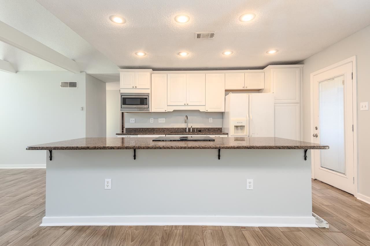This stunning 4-bedroom home offers the perfect balance of style and function. Step inside to soaring vaulted ceilings with exposed beams, a cozy brick fireplace, updated lighting, and gorgeous wood-look tile flooring throughout. The open-concept kitchen is a showstopper with granite countertops, custom soft-close cabinets with pull-out drawers and built-in organizers, plus a large breakfast bar that's perfect for gatherings. The spacious primary suite is a true retreat, complete with a large walk-in closet, private bath, and sliding glass doors leading to the wood deck for morning coffee or evening relaxation. A split floor plan provides privacy with three additional bedrooms and a stylish guest bath on the opposite side of the home. Enjoy peace of mind with all new windows and a tankless hot water heater for energy efficiency. Move-in ready with a fresh, modern feel and ideally located near shopping, dining. Outside, you'll find an extra concrete pad, 2 storage buildings.