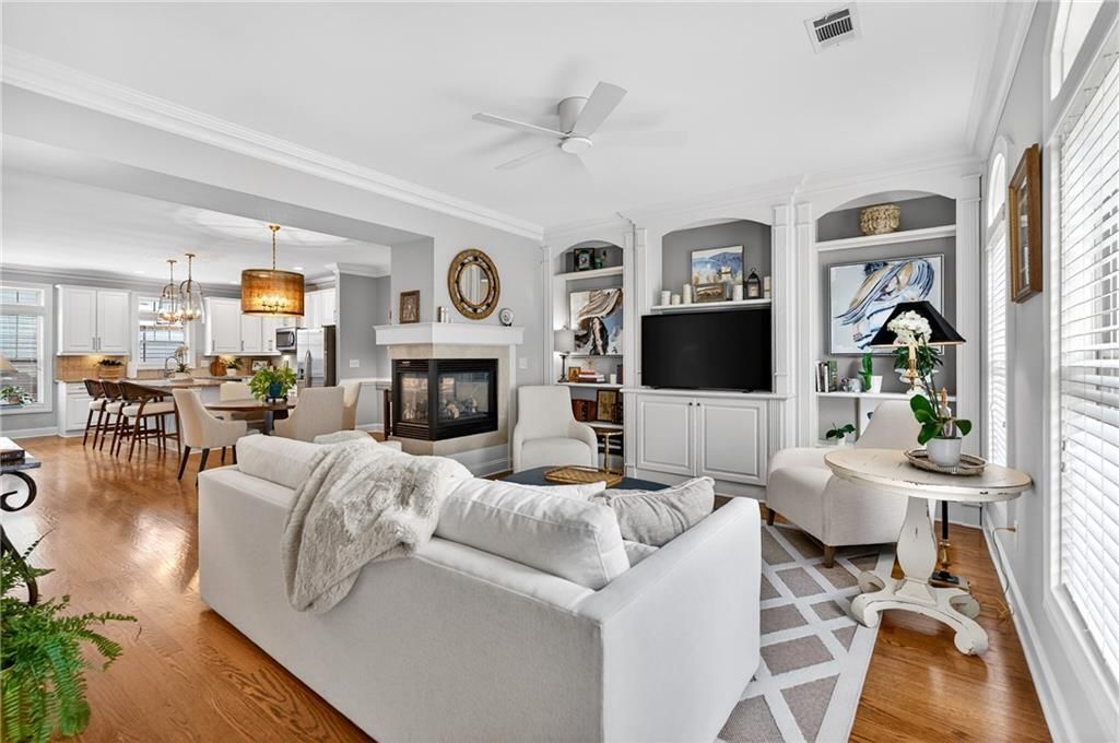 Immaculate, truly move-in ready townhome in the highly sought-after gated Jamestown community in South Forsyth! Providence Homes built this beautiful townhome. This is low-maintenance living at its best? the HOA covers exterior maintenance, landscaping, roof, gutters, termite bond, trash, pool, tennis, pickle ball, and more?allowing you to simply enjoy your home without the hassle. Tucked away in a quiet, private setting, this home features real hardwood floors on both the main level and upstairs, creating a clean and cohesive feel throughout. The open floor plan offers a bright and functional layout, centered around a beautiful kitchen with solid wood cabinetry professionally painted, upgraded hardware, luxury lighting, and a touchless faucet. Small thoughtful touches like dimmer switches throughout and a double-sided fireplace (that also serves as a great heat source) make the home feel both elevated and comfortable. Upstairs, you'll find three bedrooms including a spacious primary suite with a custom walk-in closet and a well-appointed bath featuring dual sinks, soaking tub, and separate shower. The custom pantry and additional storage throughout add to the home's functionality. Enjoy your own private patio?perfect for relaxing or entertaining?along with a two-car garage featuring plenty of added storage. Guest parking is conveniently located directly behind the unit, making it easy for visitors. Jamestown offers resort-style amenities including a pool, tennis, pickleball, sidewalks, and beautifully maintained grounds. Ideally located just minutes from GA-400, Halcyon, Avalon, Downtown Alpharetta, and the Greenway trails. This is a completely Turnkey and low-maintenance townhome in an unbeatable location; this is one you don't want to miss!