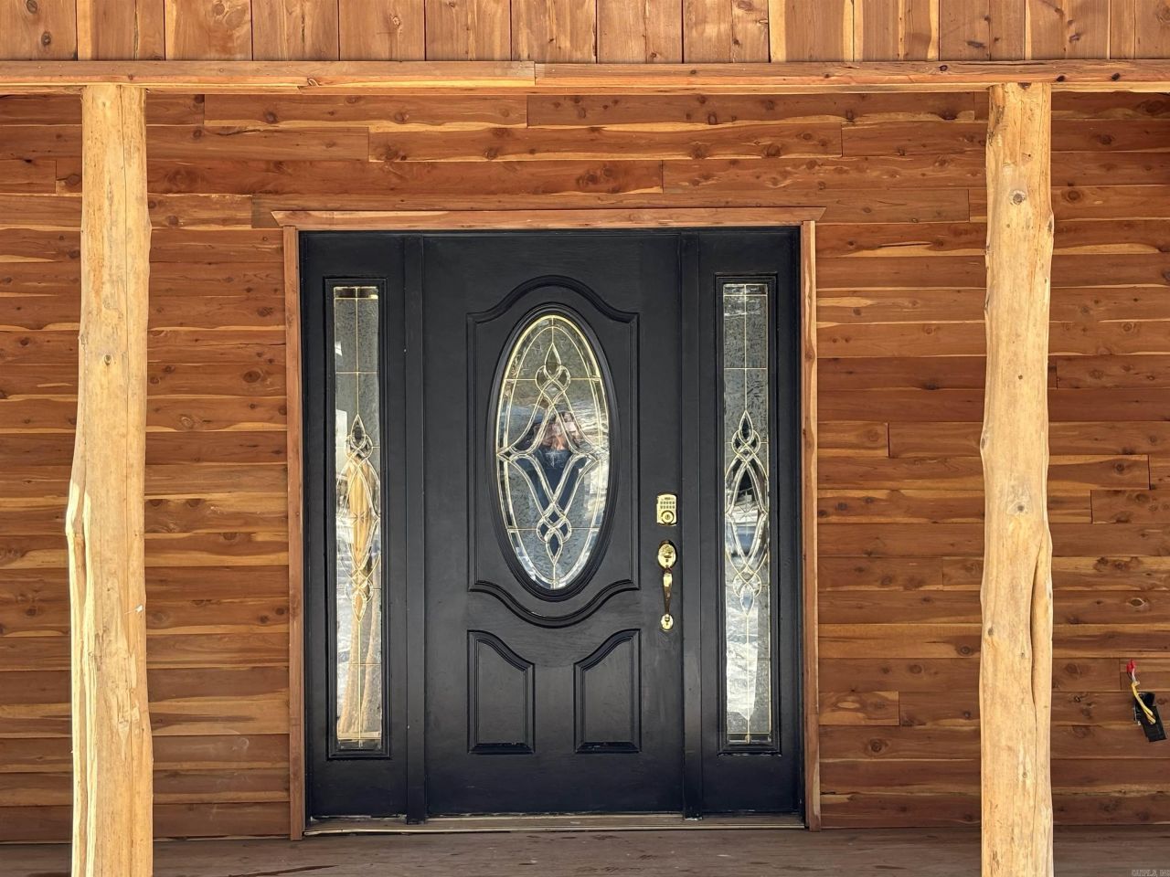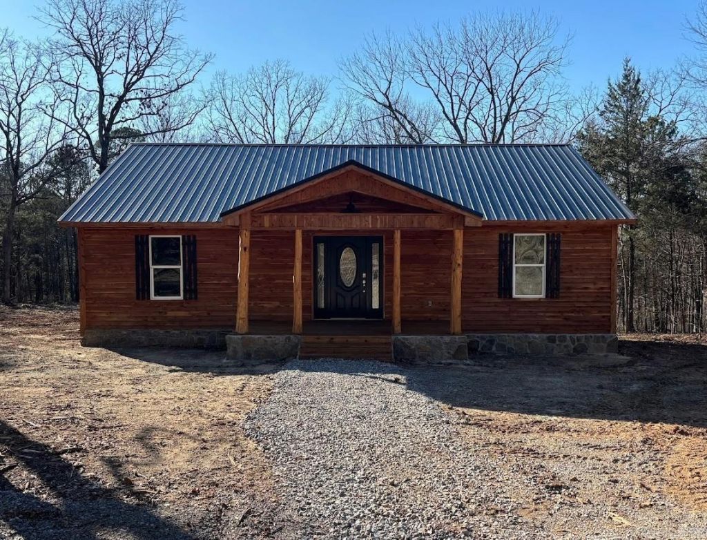 Welcome to this beautiful, newly constructed home featuring a cedar wood exterior that showcases rustic appeal and natural durability. The property boasts a metal roof, stone foundation accents and a covered front porch supported by natural log posts. Step inside to the continued cozy feel of rustic accents including cedar covered ceiling and polished wood floors. A vaulted ceiling and recessed lighting create an inviting, spacious atmosphere. Kitchen is equipped with wood cabinetry and granite countertops, along with stainless steel appliances. Step outside to the covered back deck for your own private retreat overlooking 2,000+ acres of timber company land, also known as Cherokee Wildlife Management Area. Enjoy all the wildlife nature has to offer right from the comfort of your home!