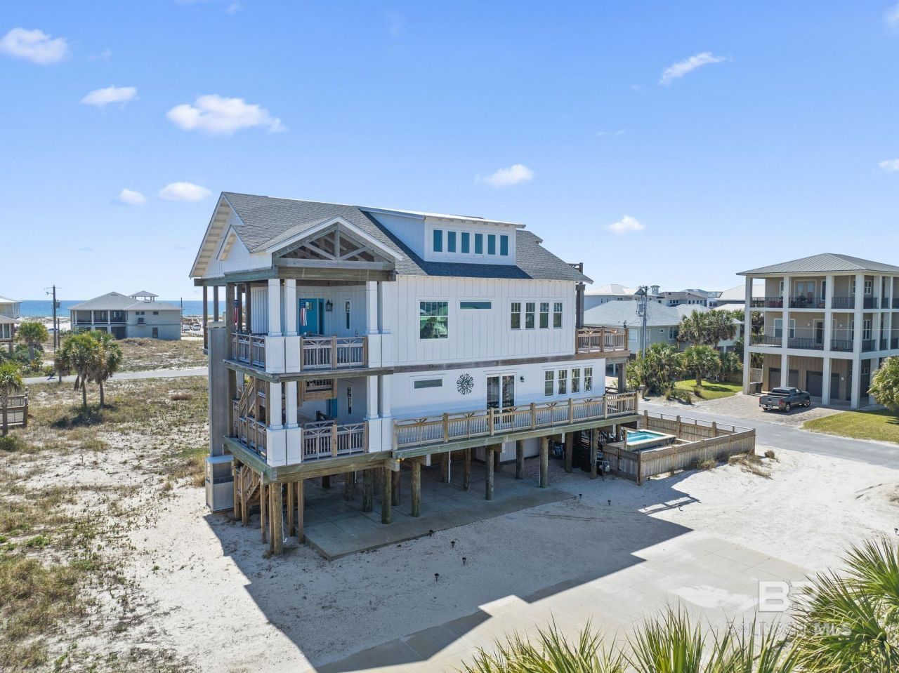Welcome to the ultimate FURNISHED beach home, meticulously crafted 5-bedroom, 4.5-bathroom Craftsman-style residence with a heated pool, hot tub, & an additional expansive bonus room. Offering unparalleled comfort & tranquility, every corner of this residence affords breathtaking views of the glistening turquoise waters of the Gulf & calming waters of the Sound. Travel upstairs or take the elevator, & step into your dream home. The living space seamlessly flows together, while also allowing privacy within the layout, with separate entry doors at the main & second level. On the main level, immediately be drawn to the impressive 25' trussed ceiling that create a sense of grandeur space, which is adorned with custom high-end Tulip poplar trim, white oak stairs, crafted to perfection & the expansive 8' accordion sliding glass doors, brightening the space with rays of sunshine & offering breathtaking views of the coastal scenery. An expansive kitchen features stainless steel appliances, complete with a wine cooler & ice maker. The primary suite, like all bedrooms in the residence, has direct balcony access. The ensuite offers its own spa-like experience, with a soaking tub, water view, rain shower, marble vanities, expansive closet, washer & dryer. Downstairs can serve as an additional living quarter for your family or guests, with a large great room, washer, dryer, & kitchenette to include sink & fridge. 3 more bedrooms, each with balcony access & water views, are on the downstairs level. Adding to the allure of this custom home are the endless possibilities of the space of the top floor bonus room, which can easily be converted to game room, bunk suite or two more bedrooms & a newly added FULL BATH with walk-in tiled shower. Outside living area is exceptional for entertaining, with its large, covered patio, heated gunite pool, hot tub, NEW POOL FURNITURE, outdoor shower, water closet, large storage area & fenced yard. Beach home or investment-LIMITLESS possibilities!