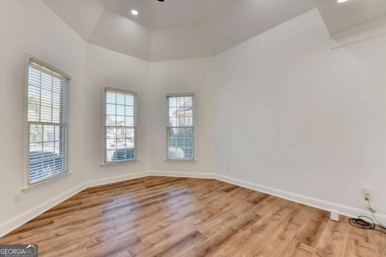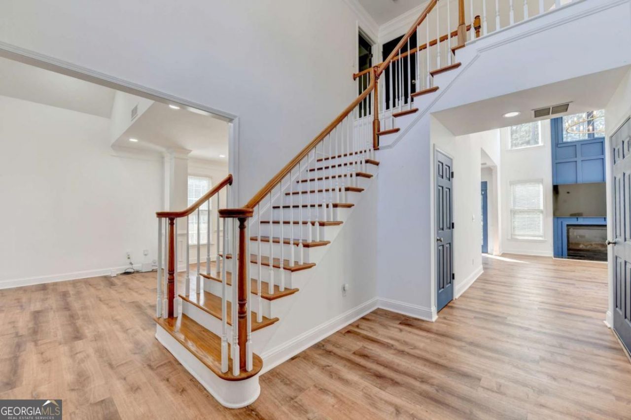 Welcome to this beautifully updated EAST FACING 5-bedroom, 3-bath home featuring a NEWLY REMODELED KITCHEN, and sought-after GUEST BEDROOM AND FULL RENOVATED BATHROOM on the MAIN FLOOR on a PRIVATE, WOODED backyard in the amenity-rich LIBERTY neighborhood! FRESHLY PAINTED with NEW LIGHTING and NEW FLOORING throughout, 6 YEAR OLD ROOF and immaculately maintained! Step in through the brick front porch into the grand 2-story foyer. To your left is an elegant OFFICE/SITTING ROOM with a bayed window and domed ceiling, along with a family-sized formal DINING ROOM with crown and picture frame molding. The fully REMODELED KITCHEN is perfect for the family chef and features CUSTOM CABINETRY, a 6-BURNER GAS COOKTOP with a VENTED HOOD, leather finish granite countertops, an extended EAT-IN ISLAND, quartz tile backsplash and a large pantry. The impressive TWO-STORY family room features soaring FLOOR-TO-CEILING WINDOWS, a marble FIREPLACE, custom accent molding, and designer lighting, creating a bright and inviting gathering space. A convenient door from the kitchen leads directly to the PATIO, making it easy to enjoy outdoor dining and the peaceful backyard setting. A GUEST BEDROOM on the MAIN LEVEL, along with a fully RENOVATED BATHROOM, offers an ideal setup for visitors or multigenerational living. The bathroom features a beautiful, intricately tiled shower, upscale fixtures, and designer custom cabinetry. Upstairs, the spacious PRIMARY SUITE boasts a deep tray ceiling and a spa-like bath with custom cabinetry, double vanity, cultured marble countertops, a whirlpool tub, tile shower and floor, vaulted ceiling, designer fixtures and a large WALK-IN CLOSET. THREE large additional bedrooms, each with vaulted ceilings, share a spacious bathroom with custom cabinetry, tile floor and tub/shower combination. The renovated LAUNDRY ROOM WITH CUSTOM CABINETRY, QUARTZ COUNTERTOP and a UTILITY SINK for added convenience, completes the upper level. Outside, enjoy the private backyard with WOODED VIEWS and a PATIO-perfect for relaxing or entertaining. Located in the desirable Liberty community, residents enjoy fantastic amenities including a clubhouse, fitness center, tennis courts, swimming pool, and playground. Ideally situated just minutes from shopping and dining, and within the top-rated Forsyth County School District, this home truly has it all!