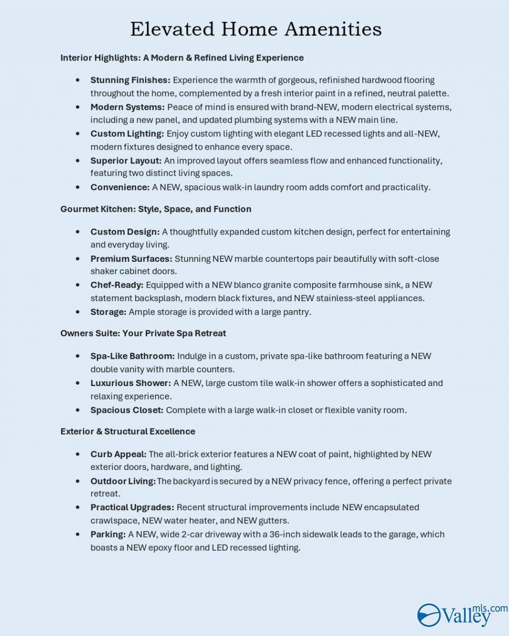 Back on the market?buyer's plans changed. Revitalized and reimagined, this S. Huntsville Ranch impresses from roof to crawl space. Freshly updated all-brick exterior and curbside improvements set the tone for the extensive renovations inside: Refinished Hardwood, Soft-close Cabinetry, Stainless Steel Appliances, Designer Lighting, Walk-in Laundry Room, Encapsulated Crawlspace...New Luxury Primary Suite, Roof, Electrical, Plumbing and MORE! Check out the amenities list in the pictures for full details. This whole-house renovation brings modern luxury to a great neighborhood near Schools, Greenway Trails, Shopping & Redstone Arsenal!!