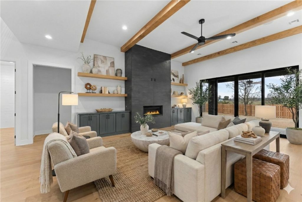Luxury residence, ideally situated in the highly sought-after Big Sky neighborhood. Exceptional high-end finishes that define every room. Main living area is a showcase of design, featuring beautiful wood flooring, crown molding, and striking wood beams. It centers around a sleek, linear tile fireplace that is perfectly complemented by custom built-ins. The kitchen is truly a chef's ultimate dream: it boasts a massive, custom-stained island, ceiling-height cabinetry, top-tier double ovens, gas cooktop complete with a convenient pot filler. All surfaces, including the expansive backsplash, are finished in pristine quartz. The primary suite is a retreat, featuring warm wood flooring, a stylish accent wall, and a spa-like ensuite. Private bath with a deep soaking tub, a large walk-in rain shower, and a generously sized walk-in closet with extra storage. Stylish study with accent wall, bonus room and a private, fenced backyard.