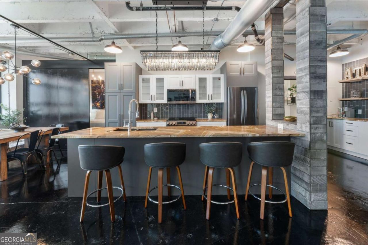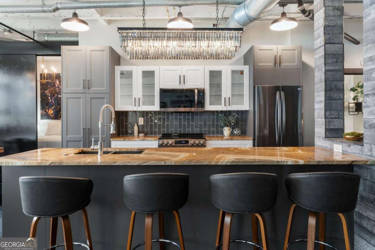 IN THE HEART OF MIDTOWN AND BEAUTIFULLY RENOVATED. Experience urban sophistication at it's finest in this sleek, sexy modern condo featuring premium finishes throughout. The gourmet kitchen details custom cabinetry, stainless steel appliances, one-of-a-kind granite and an oversized island, perfect for entertaining. Adjacent to the kitchen is the dining area with designer lighting, wall of windows and don't miss the sultry corner coffee/wine bar. The spacious family room captures ample natural light, plenty of seating space and a separate desk/work area. Retreat to the lovely primary suite, showcasing a stylish barn door, large custom closet, separate laundry area and spa-inspired bath complete with a gorgeous walk-in glass shower. The second bedroom area, equipped with a murphy bed, offers versatility - easily transforming into a permanent, private 2nd bedroom with the addition of a wall or can serve as a den, art studio or workout space. Peachtree Lofts is an iconic mid-century building located above the Vortex and offers an array of amenities: 24/7 concierge, fitness center, outdoor saltwater pool with sundeck and grill, pet friendly dog park, fabulous hangout and clubroom with WIFI, and secured garage parking with assigned spots. Steps from GA Tech, Piedmont Park, The Belt Line, The Fox Theatre, High Museum of Art, Publix, MARTA, Whole Foods, restaurants and shopping. Ideal for the discerning urbanite seeking a sophisticated sanctuary in the epicenter of Atlanta!