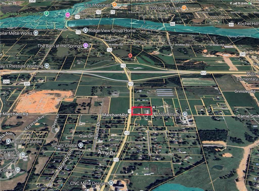 The high traffic location is primed for development and is currently zoned C-2. The property is approx. .50 miles from the 612 and 112 intersection and approx. 1.5 miles from the new airport spur. With 3.77 acres will lose an acre to the future round-a-bout. Sewer, water and gas are on site. Property will have an ingress/egress on 112 when construction is completed and on Carrie SmithThe 4,760 sf whse is in good shape and can be utilized when the property is developed.