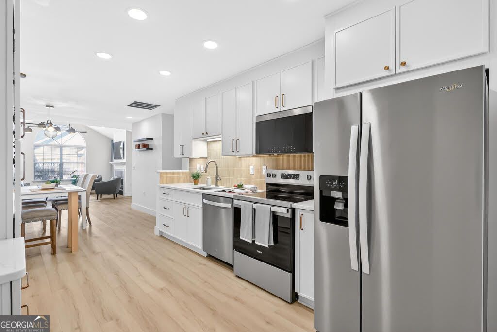 Did you know The Orchards at Hopewell is NOT an age-restricted community? Ideal for an empty nester looking to simplify, a young couple seeking walkability and low maintenance living, or a single professional who wants convenience without the upkeep of a detached home. This home delivers serious WOW factor with a complete top-to-bottom renovation and true move-in ready condition. Located in the Alpharetta Garden District less than 2 miles from Downtown Alpharetta, the setting offers both convenience and charm. The open concept layout is ideal for entertaining, with the kitchen and dining area flowing into the fireside family room. The fully remodeled kitchen features white shaker cabinets with soft-close doors and drawers, quartz countertops, stainless steel appliances including refrigerator, dishwasher, electric range, and air fryer/microwave combo, plus thoughtful upgrades like hard-wired under-cabinet lighting with motion sensors, a built-in pantry cabinet with pull-out drawers, and USB outlets. The spacious primary suite includes a large walk-in closet and a beautifully renovated bath with a custom vanity, quartz counters, lighted mirror, and a new tiled shower with rain head and built-in bench. The secondary bath is also fully updated with new vanity, lighted mirror, and custom tile surround with a new bathtub. Additional upgrades include wide-plank LVP flooring throughout with no carpet, smooth ceilings, fresh paint, and all new lighting with added recessed lighting in the main living areas. The two-car garage offers ample storage, and the private fenced patio is perfect for enjoying a spring afternoon. The neighborhood pool and clubhouse are just steps away. Pride in ownership definitely shows in this meticulously-maintained home! Honesty a RARE find!