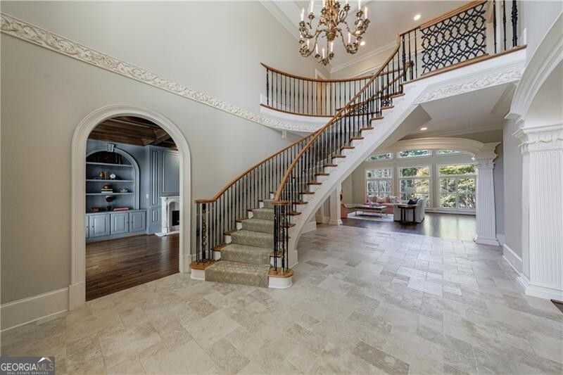 Exquisite European-Inspired Estate in Country Club of the South is set along a fairway of the prestigious Country Club of the South golf course. This elegant all-brick European-style residence combines timeless architectural detail with modern sophistication and offers unparalleled craftsmanship throughout. A stately front portico with a coffered ceiling and double entry doors opens to a soaring 20-foot foyer entry, setting the stage for the home's grand yet inviting ambiance. The open and airy floor plan flows effortlessly from the curved floating staircase to the two-story great room, framed by floor-to-ceiling windows and features one of five exquisite stone fireplaces. Flanking the foyer are the banquet sized formal dining room and an elegant study featuring rich built-ins, coffered ceilings, and a fireplace. The chef's kitchen is a culinary masterpiece, featuring top-tier appliances, a large center island with bar seating, walk-in pantry with built-in ladder, and a butler's pantries. The adjoining breakfast room and keeping room-complete with fireplace and terrace access-create a perfect setting for everyday living and entertaining with sweeping views of the golf course. The primary suite on the main level is a private retreat with a fireside sitting area, two custom walk-in closets, and a luxurious marble bath with dual vanities, make-up desk, jetted soaking tub, and multi-head shower. Upstairs, you'll find two en-suite bedrooms, each with private baths and large closets and two bedrooms with an adjoining bath, each with large closets. An expansive finished attic (over 1,000 sq. ft. not included in the total square footage) with permanent stair access finishes off the 3rd level. This space offers conditioned air and is ready to customize. The terrace level is designed for entertaining on a grand scale, featuring a full secondary kitchen,, fireside family room, game and fitness areas, home theater, office, hobby and tool rooms, and a stunning English pub bar adjoining a temperature-controlled wine cellar and tasting room. There is also a guest en-suite with an adjoining bath and large closet space. Outdoor living is equally impressive with a fenced, level backyard and upper and lower stone terraces overlooking the manicured golf course-ideal for relaxation or entertaining. The property also offers ample space for a custom pool addition. Located just steps from the community clubhouse, pool, and tennis facilities, this residence provides easy access to all the world-class amenities that define Country Club of the South-including 24/7 gated security, tennis and pickleball courts, Olympic-sized pool with waterpark, playground, tot lot, basketball courts, community park, and year-round social events. Optional Country Club membership is available which includes a Jack Nicklaus Signature Golf Course. Experience refined living and timeless elegance in one of Atlanta's most prestigious gated golf communities.